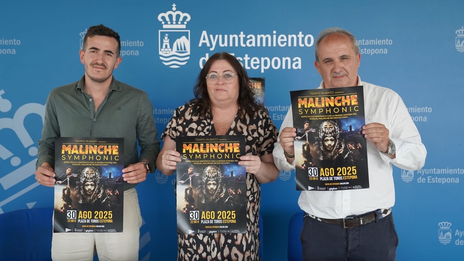 The councilor attached to the delegation of Culture and Festivals, Macarena Diánez, and representatives of the company Emell Events, Alejandro Martin and Miguel Martin, today presented the show Malinche Symphonic, a new and spectacular stage proposal that comes to the Plaza de Toros de Estepona on August 30.