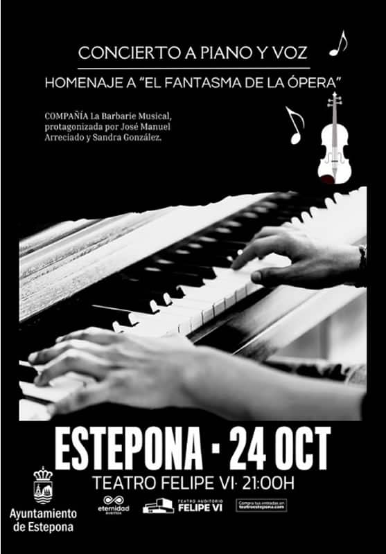 The Estepona Town Hall informs that the Company La Barbarie Teatro Musical will offer an intimate concert of piano and voice, with live music of songs, tribute to the acclaimed and classic musical ‘The Phantom of the Opera’. A concert that will undoubtedly delight the most knowledgeable musical theater audiences nationwide.