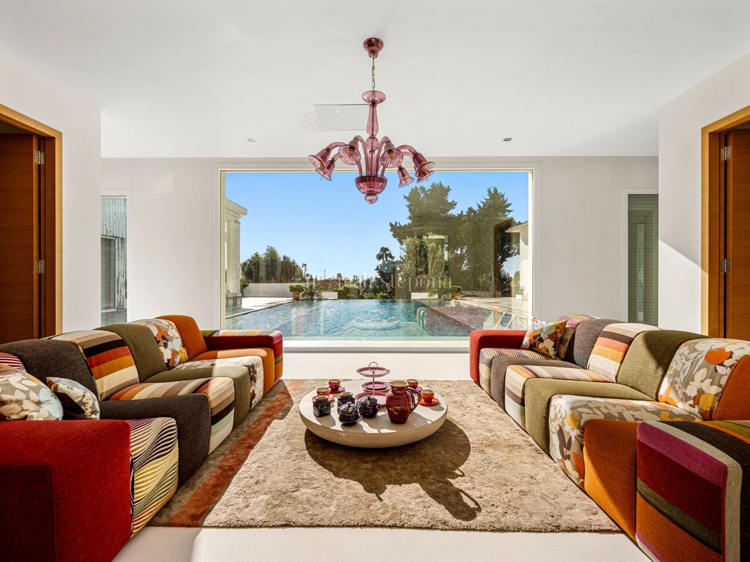 Upstairs, the villa offers generously proportioned bedrooms, each with its own bathroom and walk-in closets, ensuring privacy and comfort for residents and guests alike. The master suite is particularly impressive: a spacious private retreat featuring a lounge area, extensive wardrobe space, and a luxurious oversized bathroom. From the upper floor terrace, a private jacuzzi awaits, offering breathtaking views that stretch from the Mediterranean Sea to the surrounding mountains – an exceptional setting for sunset moments.