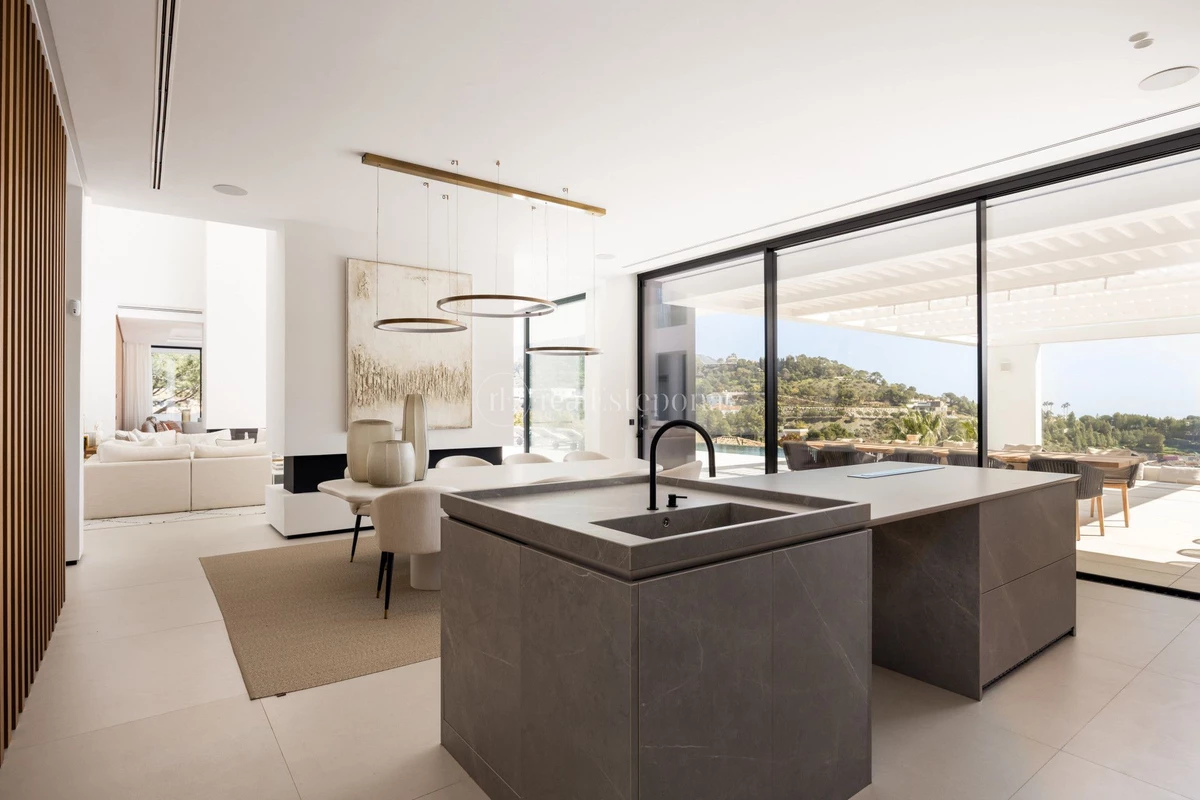 Thoughtfully designed to embrace its surroundings, the villa centers around a light-filled open-plan living space where panoramic mountain and sea views take focus. A striking entrance leads into a spectacular double-height living area, seamlessly connected to an elegant lounge, formal dining space, and a sleek designer kitchen. A beautifully appointed guest suite completes this level. Expansive floor-to-ceiling windows open onto generous terraces and a stunning infinity pool, creating a seamless indoor-outdoor flow and allowing the views to be enjoyed from every angle.