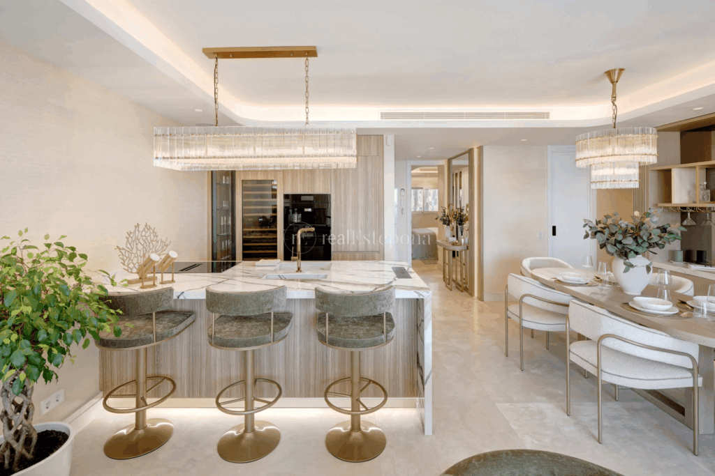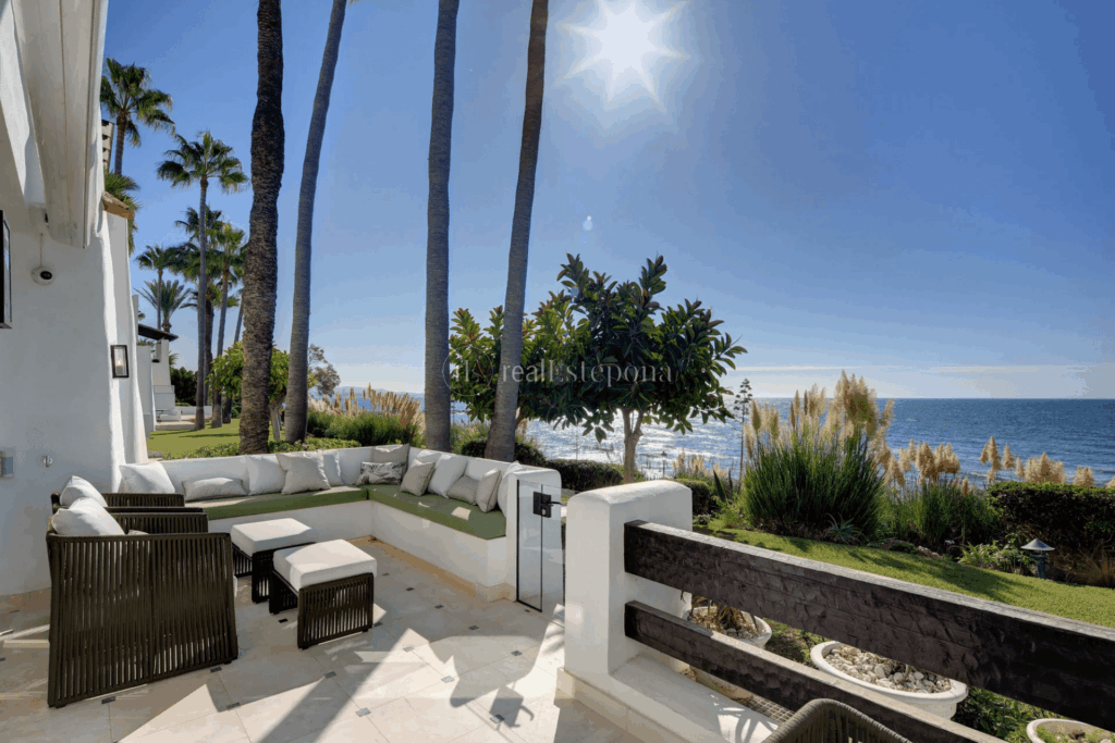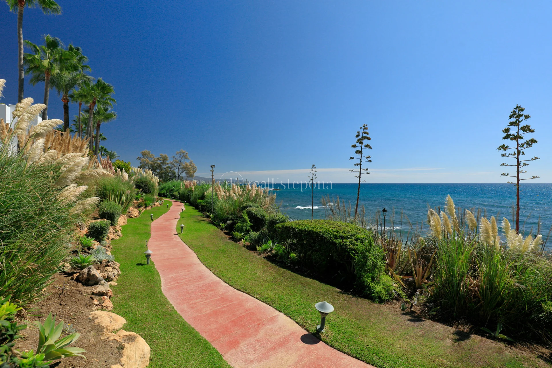 This exceptional ground-floor apartment, located directly on the beachfront within Marina Puente Romano, one of the most sought-after complexes in the Golden Mile and part of the luxurious Puente Romano complex. It has undergone a complete high-level renovation, offering stunning views. Upon entering the property, you’ll find a bright and spacious open-plan kitchen/living/dining area that leads to a partially covered terrace with fabulous sea views, a separate kitchen with a utility room, 2 en-suite bedrooms, and a guest toilet. Private parking space and storage included in the communal underground garage. The gated community provides 24-hour security and boasts beautifully mature gardens with an impressive pool. Ideally situated with all amenities and services at hand and just a few steps from the beach and promenade. A unique opportunity to acquire property in this remarkable location.