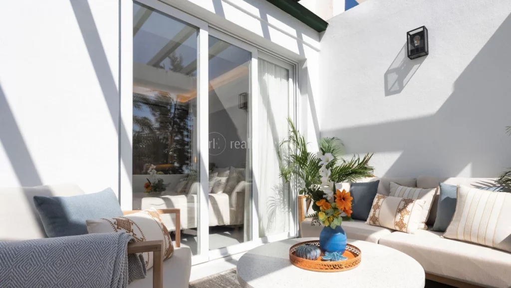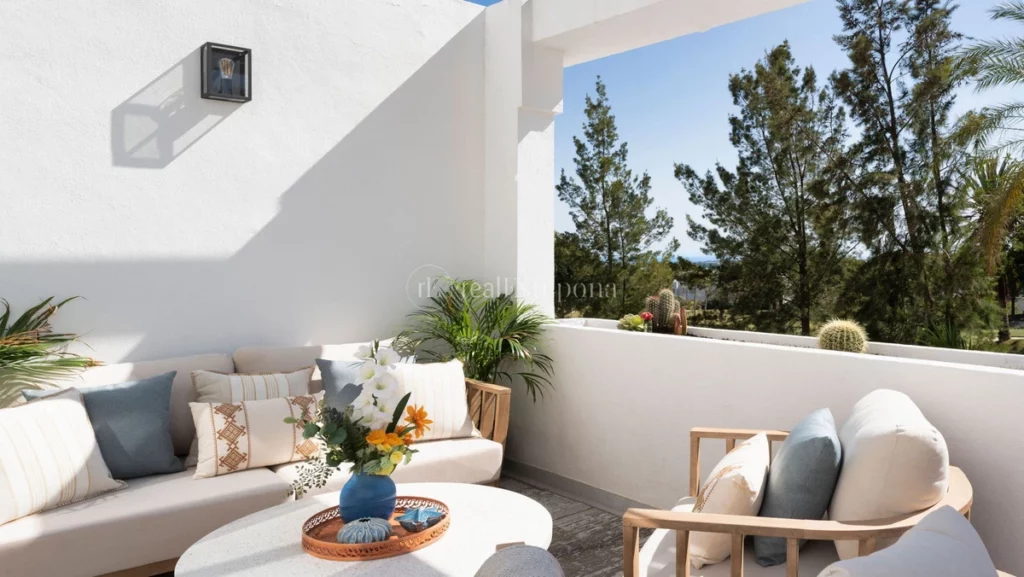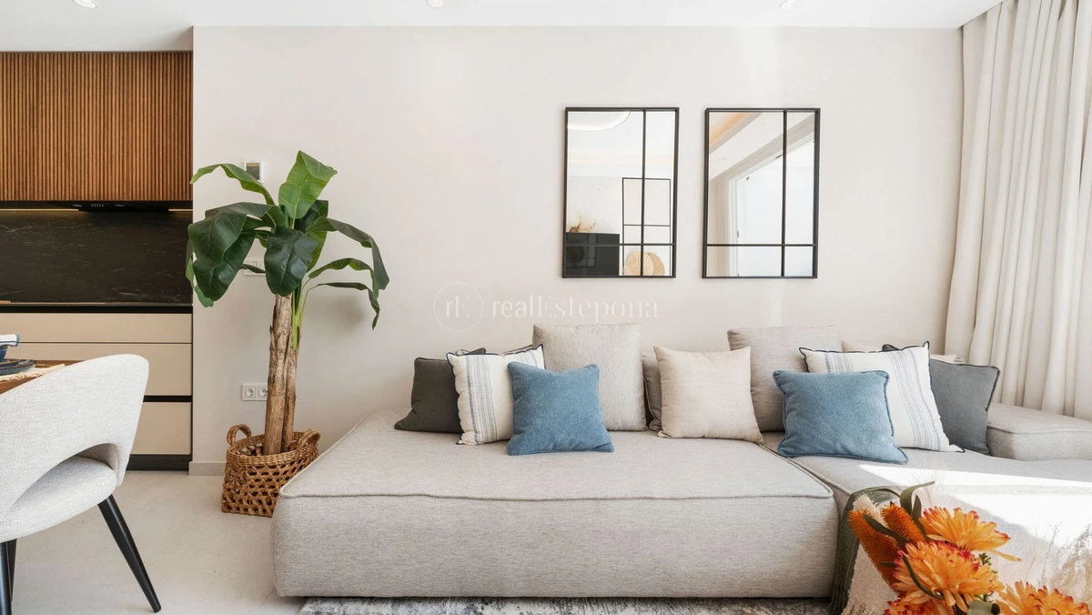 This contemporary apartment, boasting warm, earthy details and top-notch finishes, is available for sale in Terrazas de La Quinta, Benahavís. The property includes three bedrooms and two bathrooms, one of which is en-suite, as well as a guest toilet. The apartment covers a single floor with a total built area of 129m², which includes 109m² of interior space and a 20m² terrace. Originally built in 1988 and renovated in 2024, this apartment is situated in a very quiet, well-maintained, gated community, front line to La Quinta Golf. The southwest orientation offers breathtaking views of the sea and golf course. Conveniently located, it is just five minutes from shops, ten minutes from schools and the beach, and close to several key locations: El Coto Restaurant (2 minutes), Ronda (45 minutes), Puerto Banús (10 minutes), and Nueva Andalucía (5 minutes). The layout features an open-plan kitchen with an island that extends into a dining area, three bedrooms, a master en-suite, and a spacious terrace with beautiful golf and sea views.
