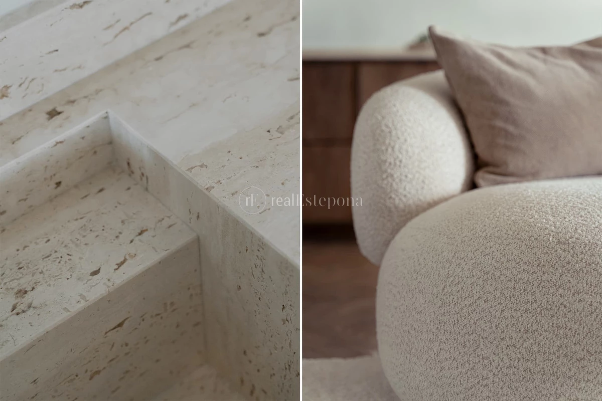The day area, open concept, integrates kitchen, dining room and living room in a continuous space that extends to a south facing terrace. From there you enjoy views of the sea completely clear, creating a perfect framework both to start the day calmly and to contemplate memorable sunsets. The large windows flood the house of natural light, reinforcing its serene and welcoming atmosphere.