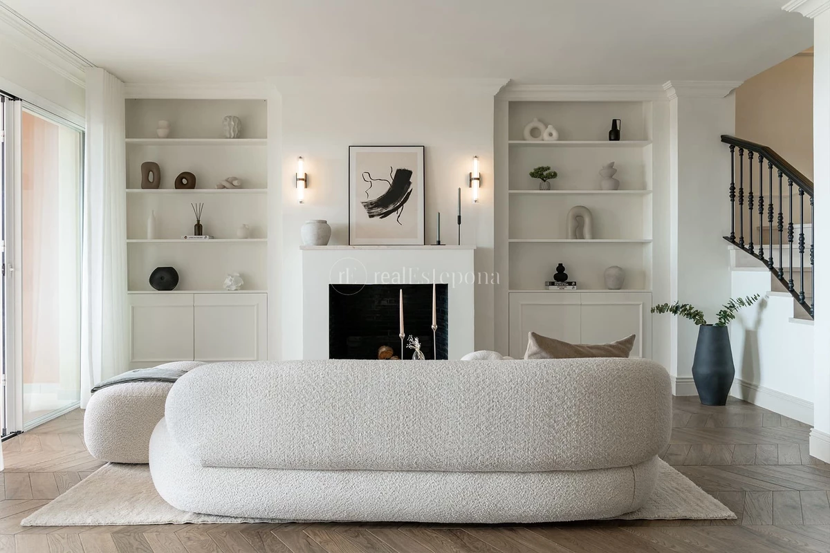 This spectacular duplex of 4 bedrooms and 3 bathrooms, recently renovated, represents a harmonious fusion between the purity of Scandinavian design and the essence of the Mediterranean lifestyle. Bright, spacious and carefully conceived, it conveys a feeling of warmth and comfort thanks to its natural wood finishes, its sophisticated microcement staircase and delicate stucco mouldings of Nordic inspiration.