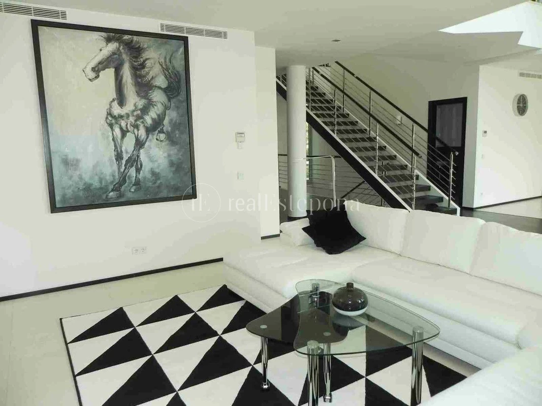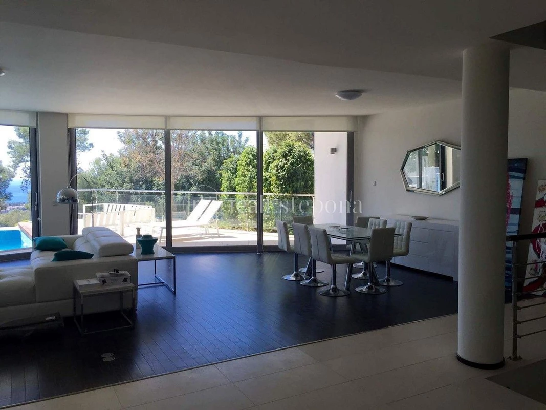 The home stands out for its spacious layout, natural light and contemporary design. It features four bedrooms, each with its own en-suite bathroom equipped with a hydromassage bathtub and separate shower, as well as a guest toilet. The large open-plan living area connects seamlessly with a modern kitchen and leads out to the private garden, where a beautiful pool creates the perfect space to relax throughout the year. Two additional terraces offer ideal spots to enjoy the panoramic views, and the property includes a private garage for two cars.