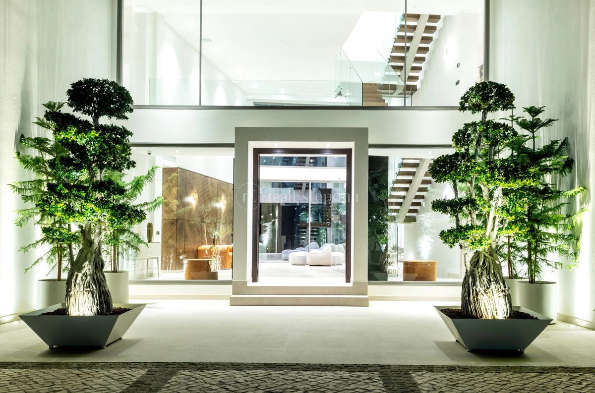 This impressive property features a majestic entrance, with a driveway leading to impressive double doors and a glass facade offering stunning sea views. Situated on a flat plot of 5,394m2, it boasts a large living room with a loft-style staircase leading to a rooftop solarium.