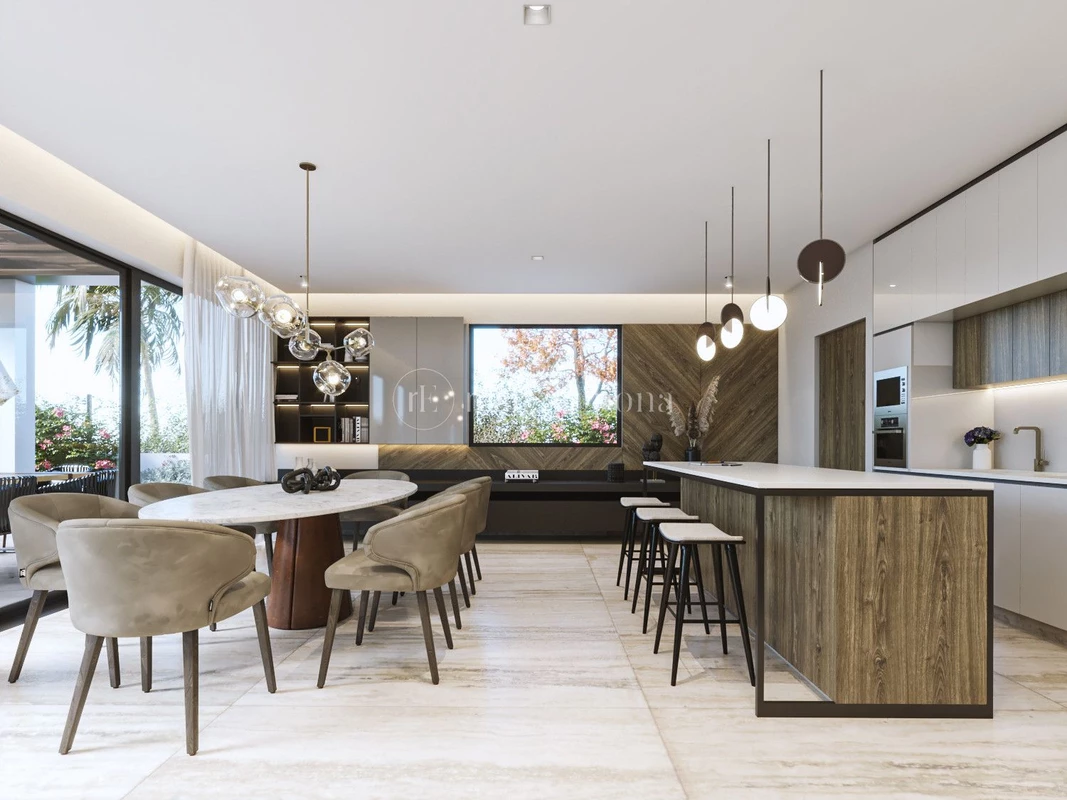 this villa epitomizes modern design, blending premium materials with a contemporary yet inviting and timeless architecture. Offering 4 bedrooms and 3 bathrooms plus a guest toilet, the villa boasts an impressive entrance hall leading to a spacious living and dining area with an open-plan kitchen, laundry, and access to the porch and stunning swimming pool. The ground floor also features a guest bedroom or office and a guest toilet. Upstairs, discover the master bedroom with a dressing room and ensuite bathroom, along with access to a sizable terrace, as well as two secondary bedrooms and an additional bathroom. Additionally, the villa includes a 142.60m² basement featuring a versatile multiuse room with natural light, a bathroom, storage space, and a tech room.