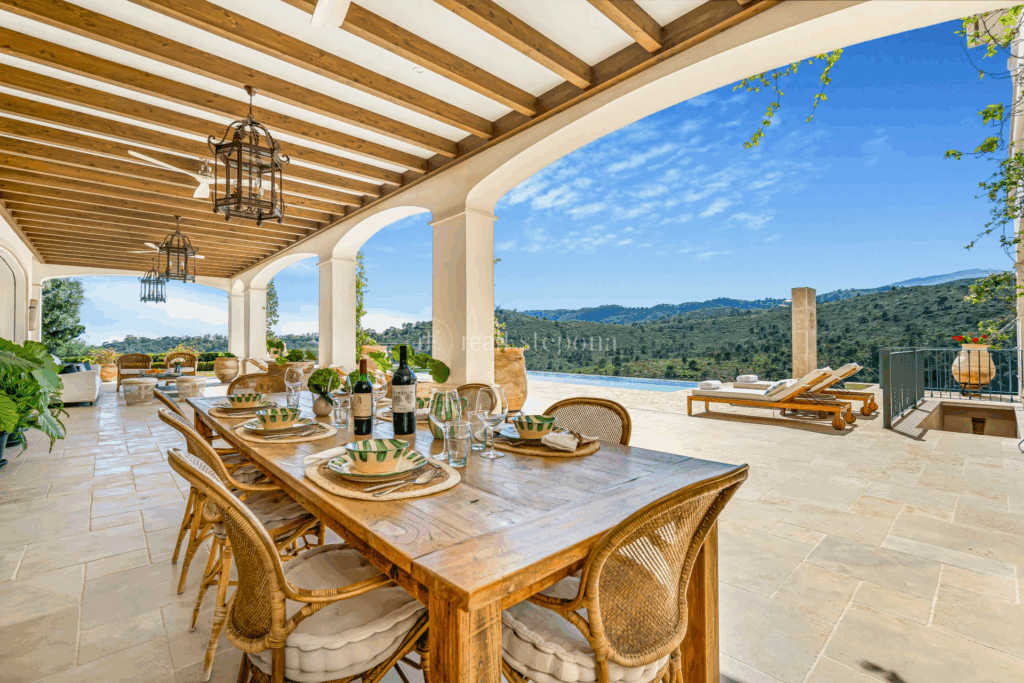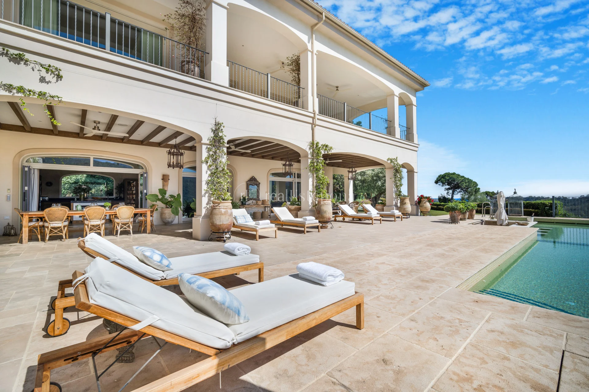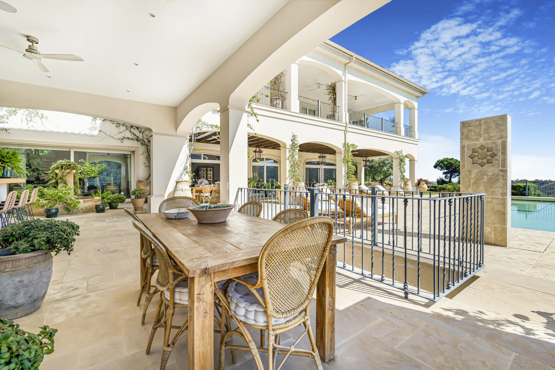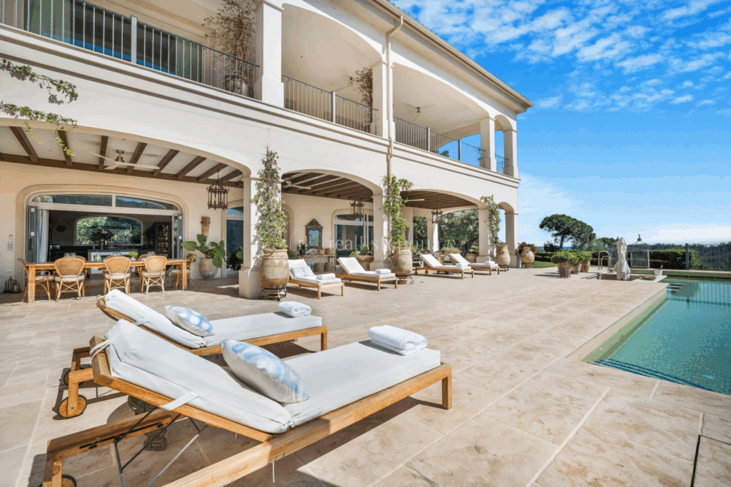 The master bedroom has a transparent bathroom, walk-in closet, and access to a porch with unbeatable views. The lower level includes a cinema for 12, professional wine cellar, hammam, gym, guest apartment, and relaxing terrace. The villa features solar panels, underfloor heating, security alarms, and a Bang and Olufsen sound system.