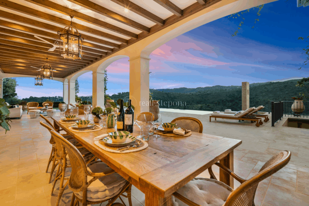 This impressive villa is in a privileged location, on the edge of a natural park with the Guadalmansa river running through the valley, offering magnificent views of the hills and the coast. Located in Monte Mayor, a secluded and guarded community just 6 km from Benahavís and 7 km from the coast. Upon entering, an impressive granite courtyard leads to a large triple carport with a thatched gazebo roof.