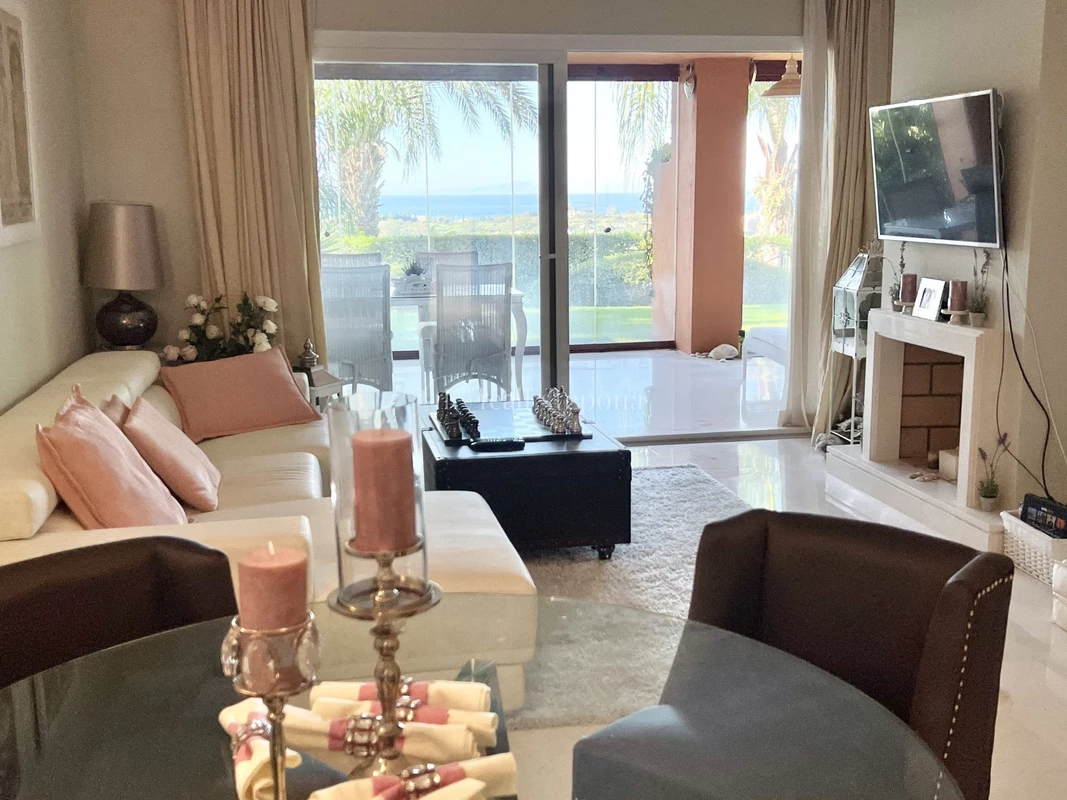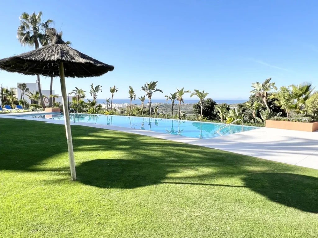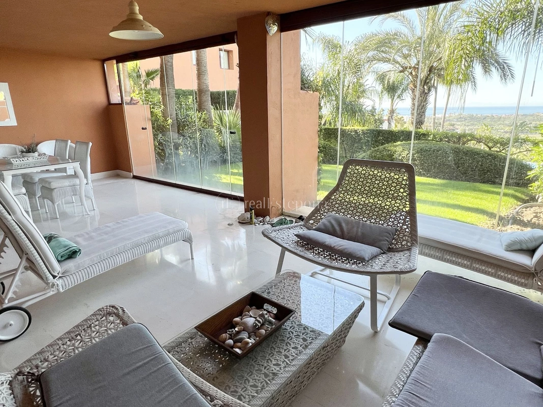 Apartment Mirador Los Flamingos with panoramic and spectacular views of the sea. There are 3 golf courses of Los Flamingos only a few minutes walk from the urbanisation, whose owners can also use the services of the 5-star hotel, Villa Padierna Palace Hotel. This apartment is located in one of the most exclusive and luxurious urbanisations of Los Flamingos. This prestigious complex offers plenty of opportunities for people who love peace, relaxation, gastronomy and nature. The project combines the elegance of a traditional architectural style with elements of contemporary architecture. This ground floor apartment has the following layout: entrance hall – private space with 2 bedrooms and 2 bathrooms – the master bedroom has an integrated dressing room – modern kitchen with appliances and access to a small terrace – living space with lounge, dining area and fireplace – access to the covered terrace of 40m², with a beautiful view over the pool, the sea and the adjoining golf course. This apartment also has an enclosed parking space and a storage room. Private terrace & garden Covered terrace and private garden. South-facing and view over the pool and sea. The terrace is with glass curtains, to enjoy the Mediterranean weather all year long! Communal garden Beautiful garden with large swimming pool with sun loungers surrounded by green gardens, palm trees and a beautiful view over the sea, golf course and the mountains. It is perfect as a holiday or long-term home, and has a high rental potential for those looking for investment potential.