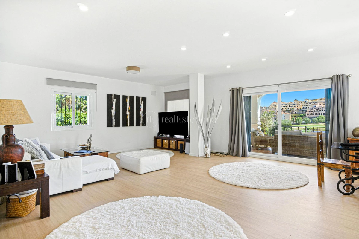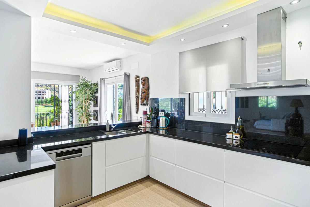 Fantastic villa with golf views in the prestigious area of Valle Romano (Estepona), located near the beach, supermarkets, restaurants, and beach bars. This property enjoys a southwest orientation and offers a perfect combination of comfort, privacy, and an excellent location in a quiet and well-connected area. The house is distributed over three floors, on the main floor, there is a spacious living room with direct access to the terrace, garden, and private pool; a fully equipped kitchen; two bedrooms; and a full bathroom. The upper floor features the master bedroom with en-suite bathroom and access to a large terrace with fantastic views. The lower floor includes two additional bedrooms and one bathroom. One of the rooms is currently used as an office, and this level offers the possibility of being converted into an independent apartment. Other features include fitted wardrobes, storage room, private garage, alarm system, security cameras, and solar panels.