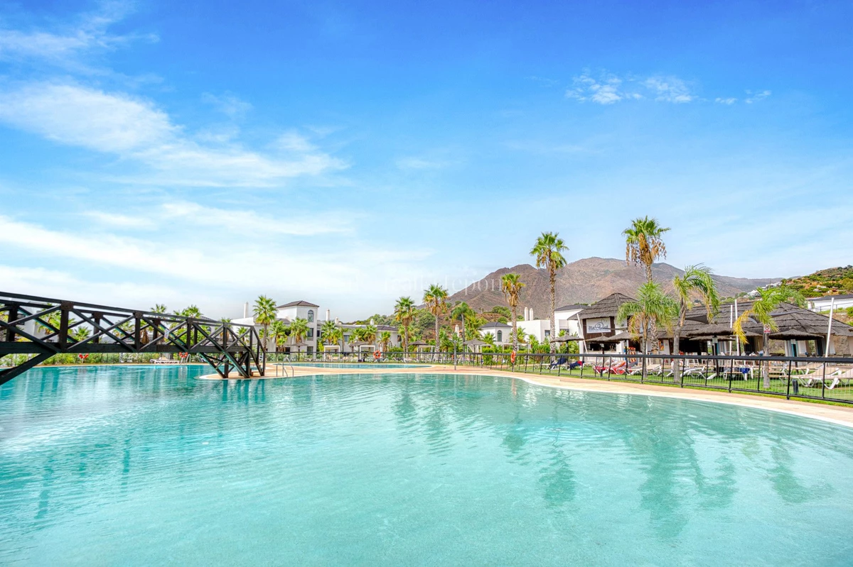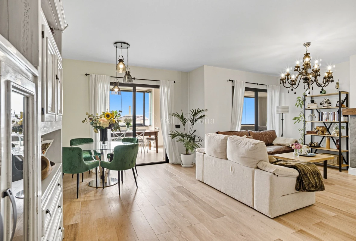 Stylish south-facing three bedroom middle-floor apartment with spectacular sea views, located in the prestigious Mirador de Estepona Hills. This luxurious gated community offers year-round heated infinity pools, tropical gardens, sports facilities, gym, exclusive pool club, concierge service and 24-hour security, all just 800m from Estepona’s centre. The apartment features high-quality finishes, a fully equipped kitchen with laundry area, spacious living and dining room with fireplace and large covered terrace, master suite with en-suite bathroom, large walk-in wardrobe and direct access to the private terrace, plus two guest bedrooms sharing a family bathroom and an additional guest toilet. Further benefits include air-conditioning, parking space, storage room, and the option for short-term rentals making it a perfect investment opportunity.