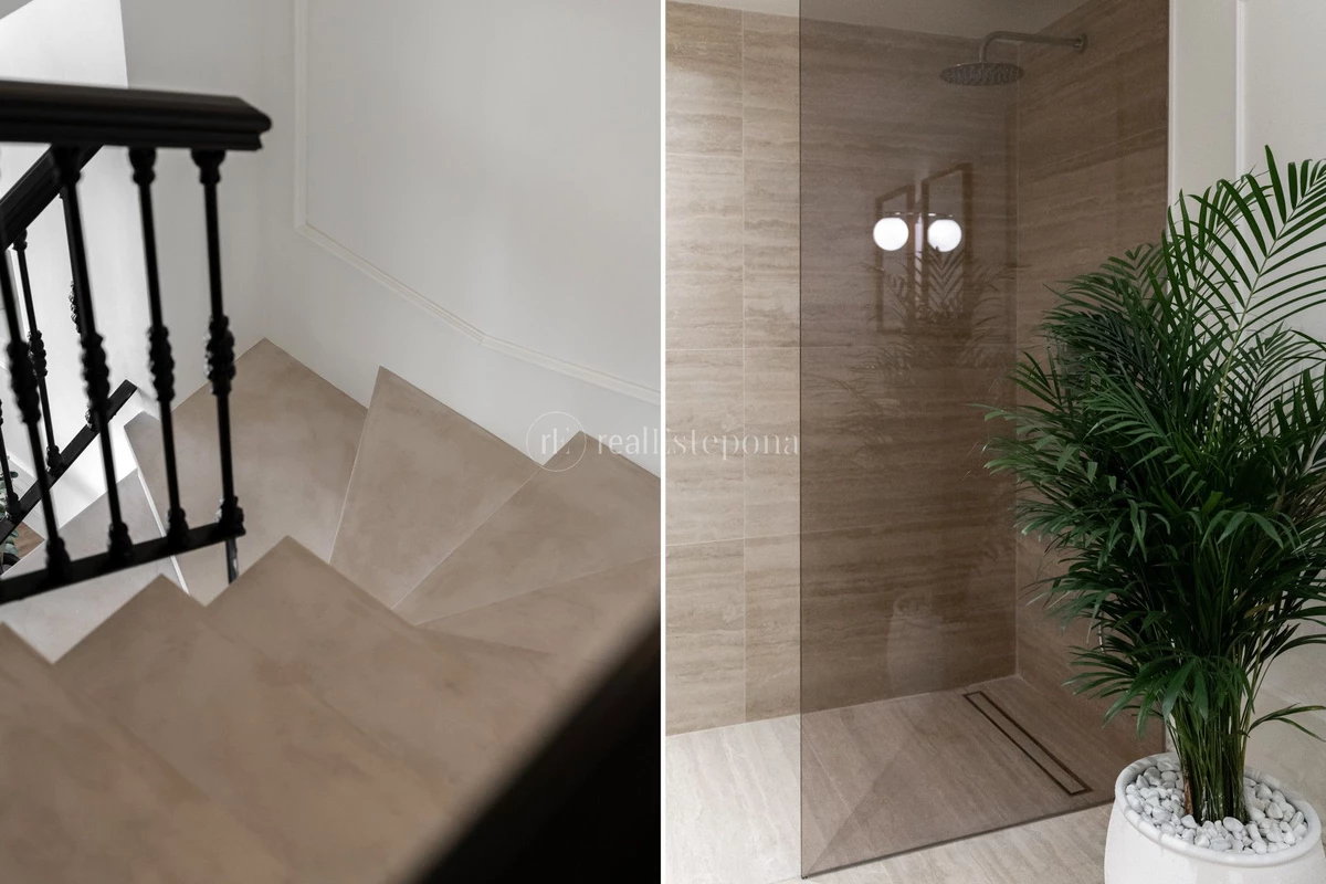 and inviting atmosphere with natural wooden details, a sleek microcement staircase, and