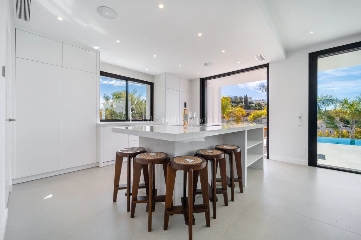 The property offers approximately 470m² of built space and has been thoughtfully designed to combine comfort, light and a natural connection between indoor and outdoor living. The main living areas are spacious and open, with large sliding windows that create a seamless transition towards the terraces, garden and infinity pool, all enjoying panoramic views over the Mediterranean.