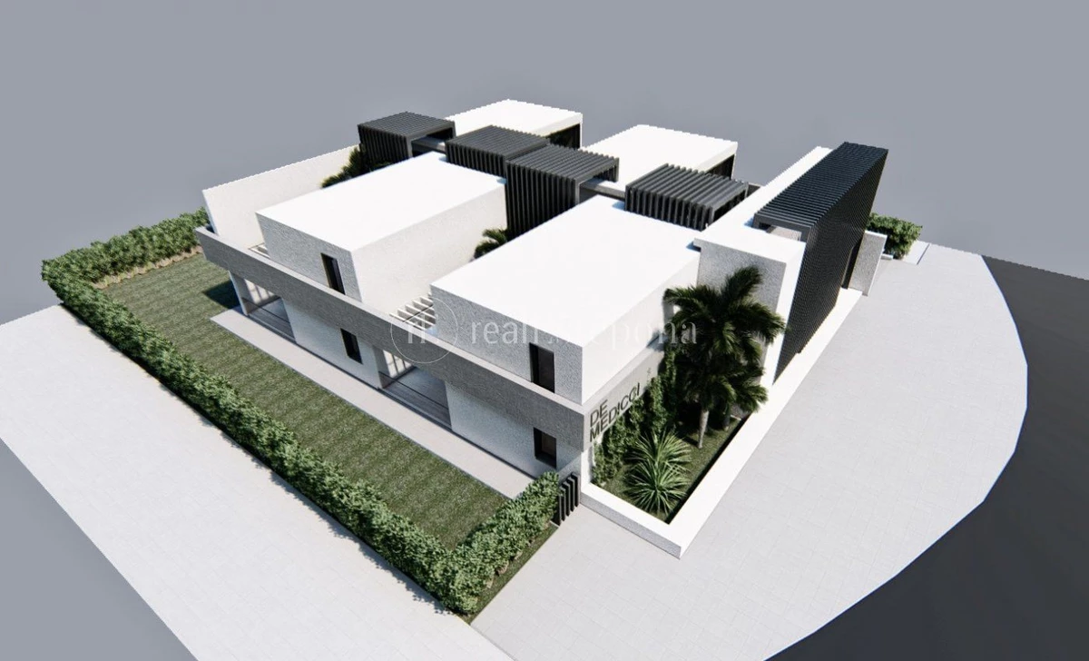 The northern section of the plot allows for the construction of 8 offices or commercial units, arranged in 4 buildings, each divided into two loft-style units with ground floor, first floor, and rooftop terrace.