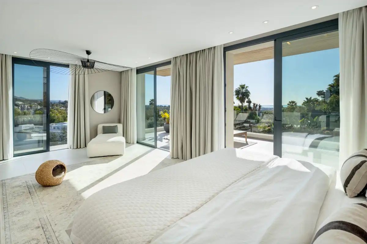 A modern villa in the prime residential area of La Cerquilla, offering an exceptional blend of luxury and convenience. Situated in Marbella’s sought-after Golf Valley, the property enjoys sea and mountain views while being just minutes from all key amenities. The villa’s contemporary design maximises natural light, with floor-to-ceiling glass sliding doors seamlessly connecting the indoor and outdoor living spaces. The open-plan layout enhances both functionality and sophistication, with a sleek modern kitchen featuring a central marble island and state-of-the-art integrated appliances.
