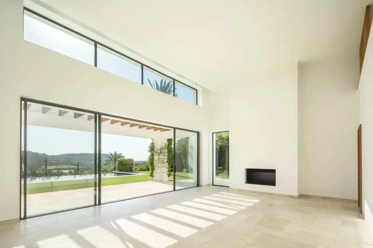 Nestled within the enclave of Finca Cortesin resort, this villa exudes the charm of Ibiza-style residences.The white structure, adorned with traditional Mediterranean stones, creates a captivating atmosphere for ultimate enjoyment. Set on a generous plot, the property boasts meticulously manicured gardens, adorned with swaying palm trees and vibrant floral bushes. A stunning pool beckons for a refreshing dip, while the covered terrace provides a delightful space for al-fresco dining and a relaxing oasis. Spanning across two floors, the villa offers direct garden access from the ground level. The inviting ground floor encompasses a spacious living, dining and kitchen area, adorned with high ceilings and abundant windows that bathe the space in natural light. The modern kitchen comes fully equipped with top-of-the-line Gaggenau appliances. Two guest rooms, with direct access to the garden, are thoughtfully located on the ground floor. The upper level of the villa is dedicated to the remaining bedrooms, each boasting its own private bathroom. The walkway connecting the rooms offers a picturesque view of the living area, creating an interior balcony-like experience. The property boasts sweeping vistas of the golf course and surrounding mountain range, providing an idyllic backdrop that radiates tranquility and serenity. The property also has a private driveway for parking convenience within the plot. With its coveted location within the Finca Cortesin resort, this villa is an ideal haven for families or those seeking to embrace the luxurious Mediterranean lifestyle in all its splendor.