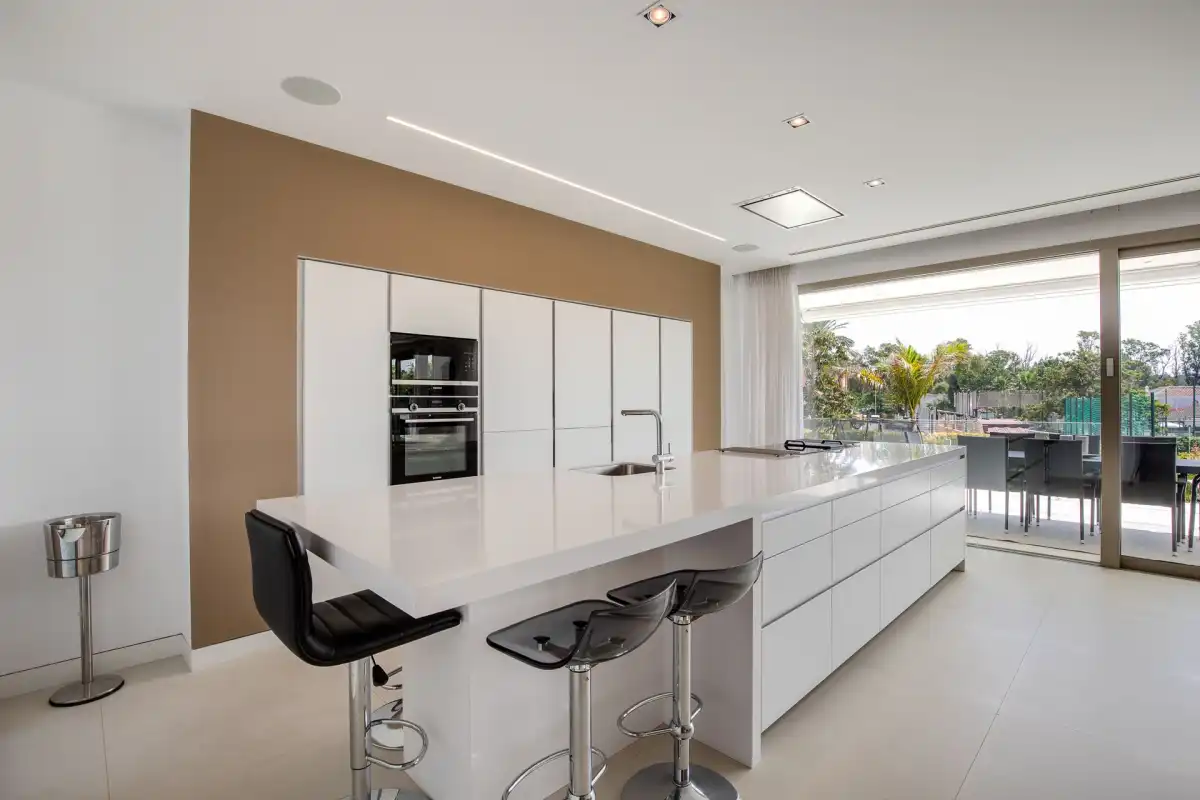 Located in the exclusive area of Casasola – Guadalmina Baja, the villa is set within a gated development of 6 villas with 24/7 security, just a few steps from the sea. Built in 2020, this property has been designed and built to the highest standards of quality and sophistication, using the latest materials, finishes and technology. Entering the property, you will be welcomed by a sense of elegance and refinement, which surrounds every space of this spacious villa, where comfort and functionality merge with aesthetics, in perfect harmony. With its 4 spacious bedrooms, each with its own en-suite bathroom, the property stands out for its cosy family space, privacy and comfort. Designed by the prestigious Bulthaup brand, the straight lines of the kitchen give this space a starring role. Its minimalist and avant-garde style is creating an inspiring space for gastronomy lovers, open onto the double living-dining room and the terrace with views of the garden and the swimming pool. And speaking of the swimming pool, you will not fail to be amazed by its imposing size of 12 x 4 metres, perfect for relaxing and cooling off on summer days. In terms of equipment and technology, the property has its own Thyssenkrupp lift, connecting the four floors, integrated Lutron home automation system and alarm, underfloor heating and air conditioning with Daikin air zone control. The exterior carpentry is aluminium, with thermal bridge break, by Schuco, and the interior carpentry is by Roman Clavero. All taps and sanitary ware are Hansgrohe and Duravit, Philippe Stark's design lines. Ample closed parking for two cars. Enclosed gymnasium equipped on the solarium floor. Don't miss the opportunity to visit this beachfront property, where every detail has been carefully selected to provide you with a living experience.