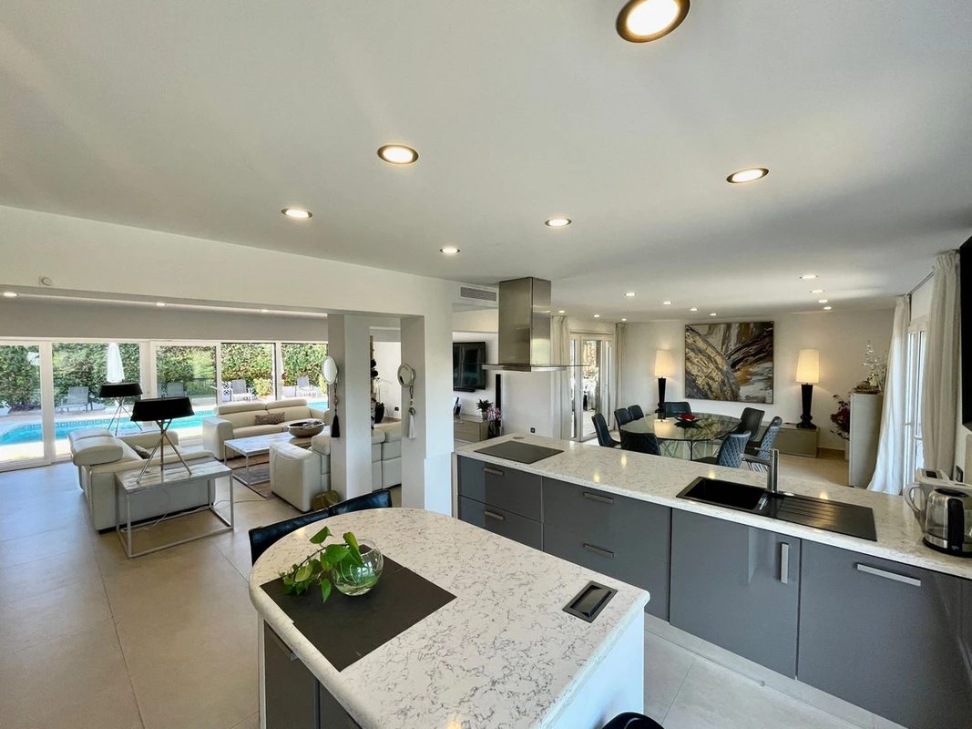 New triple glazed windows with climate glass throughout. Spacious master bedroom with Villeroy and Boch Aveo New generation Bath and China.Large south facing pool with large terraces and lawned garden .Garage for 2 cars , parking for 5 cars .Very private ,totally secure, 500 meters from the beach .