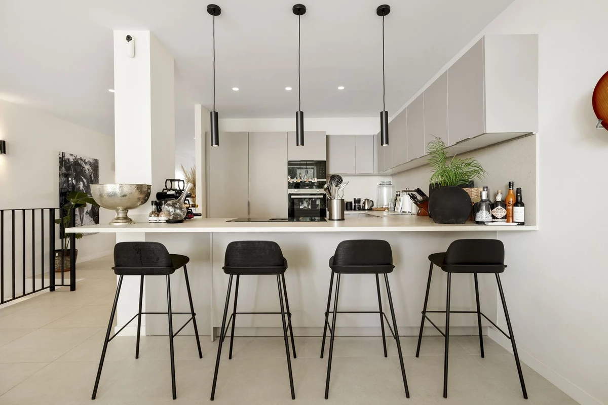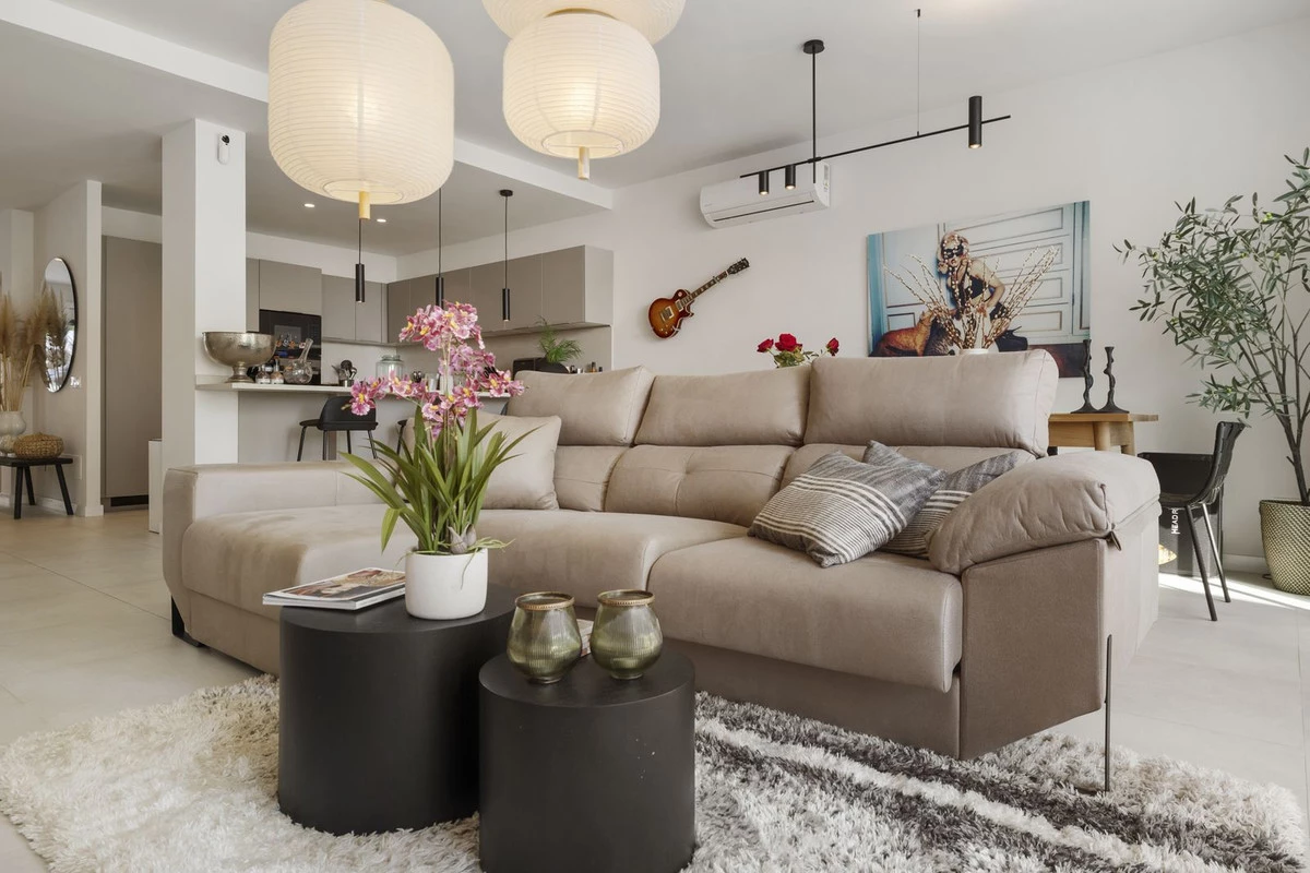 The home is spread over two levels. On the upper floor, you’ll find two bedrooms, offering plenty of space for your family, guests, or even a home office. The living and dining areas have access to a spacious terrace facing south-southwest, featuring a barbecue and a relaxing lounge area, ideal for enjoying the outdoors.
