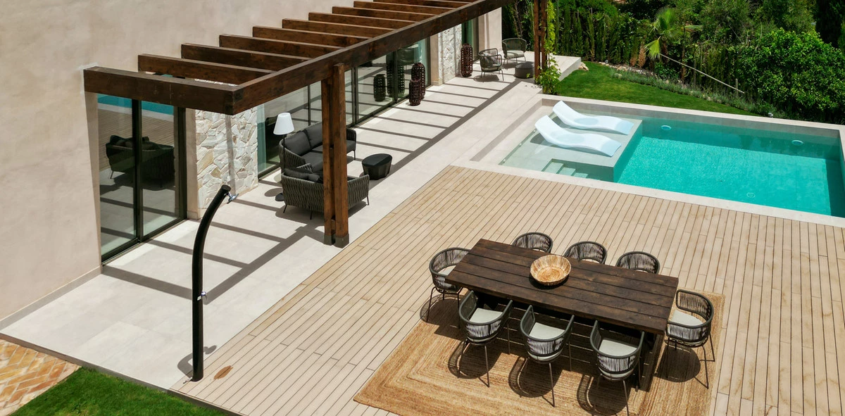 This property’s outdoor spaces are as inviting as its interiors. The covered terrace leads to a landscaped garden and features an infinity pool that enhances the panoramic sea views. Integrated sunbeds provide an ideal spot for soaking up the Mediterranean sun, while a sundeck, pergola, BBQ area, and chill-out spaces create a perfect atmosphere for social gatherings or peaceful relaxation. As the day winds down, the sunset terrace offers an ideal setting for movie nights under the stars with its unique moonlight cinema.