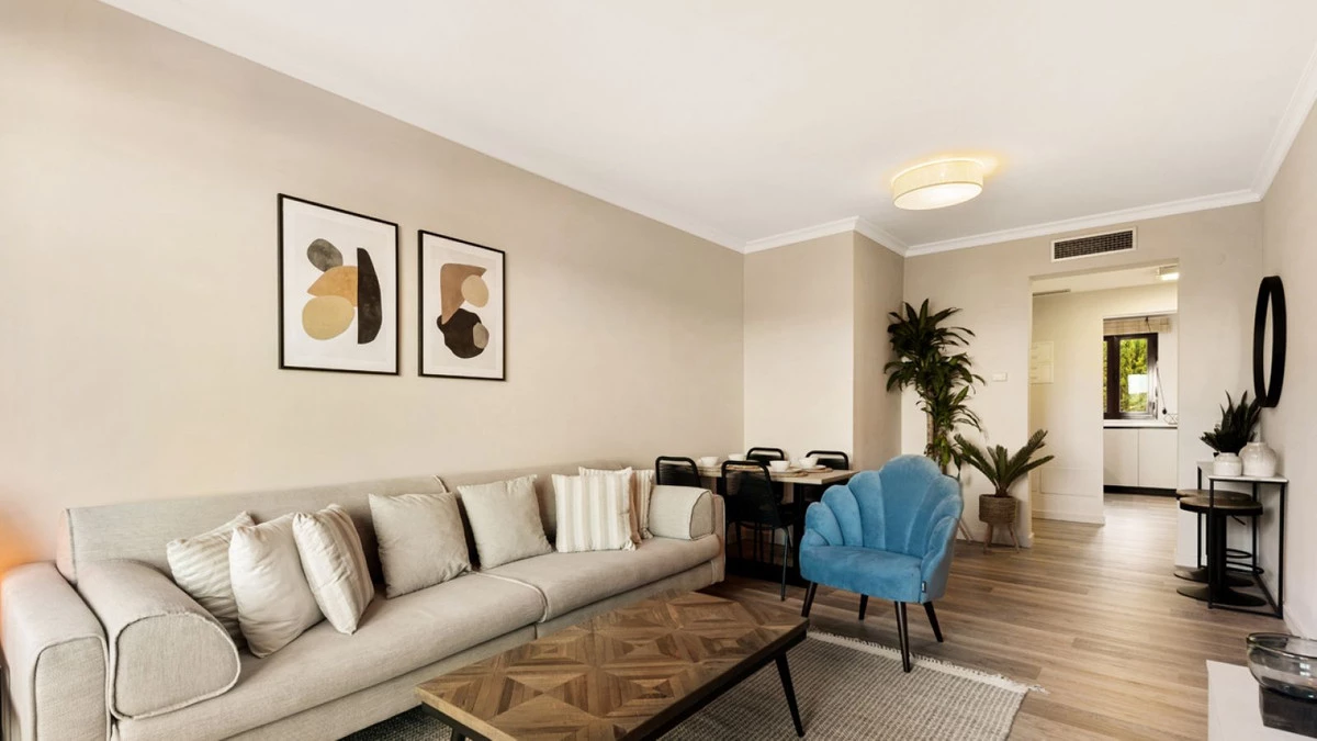 The two-bedroom, two-bathroom apartment has been fully renovated and is equipped with top-of-the-line appliances. It features a luxurious contemporary design with authentic Andalusian details, a spacious private terrace, and a large living room designed by an award-winning interior design firm.