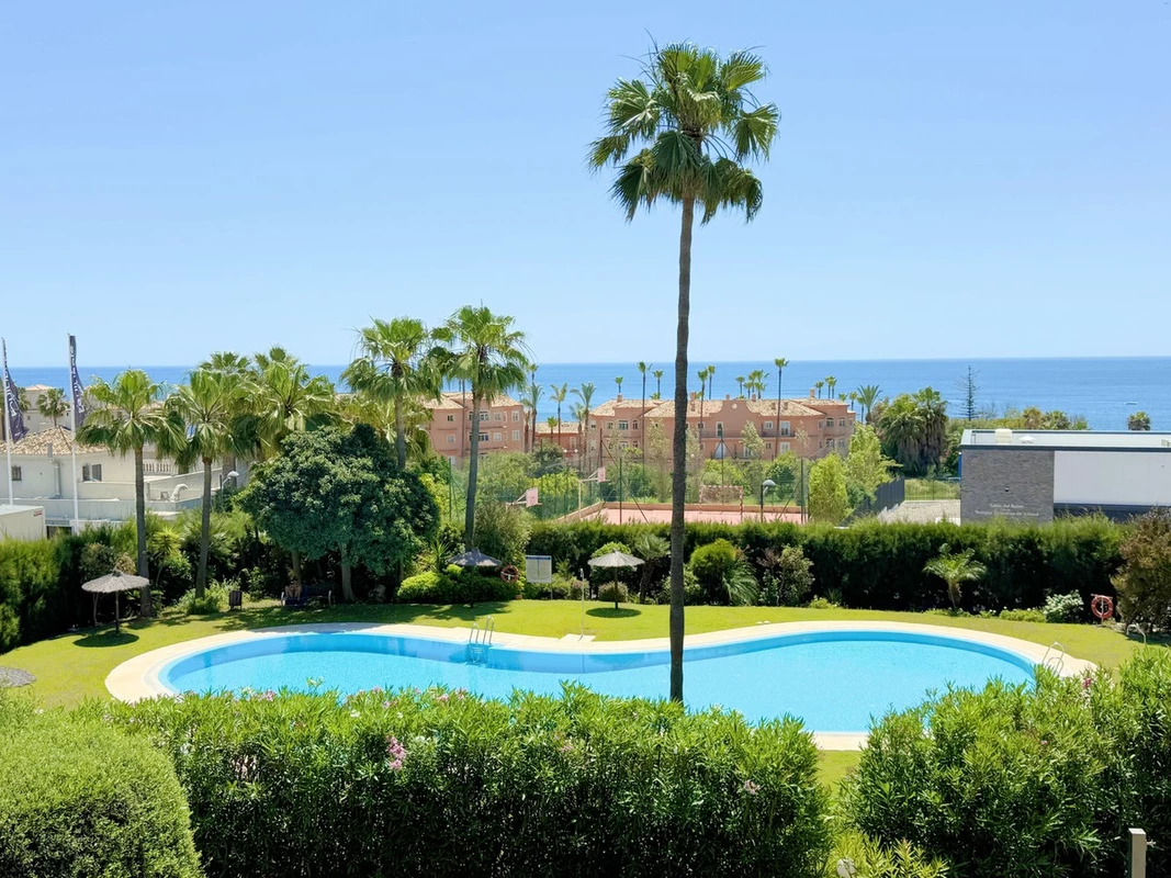 Exclusive Apartment with Spacious Sunny Terrace and Sea Views on the Estepona Coast Located on the first floor, this magnificent property offers privacy, comfort, and an unbeatable natural setting. Just 200 meters from exceptional beaches, it is set within a beautifully maintained residential complex featuring lush tropical gardens and a large year-round swimming pool. Ideally situated between the ports of Estepona and La Duquesa—both just a 5-minute drive away—where you'll find a wide variety of shops, restaurants, entertainment options, and prestigious golf courses. The apartment features 2 bedrooms and 2 bathrooms (one of them en-suite), a spacious and bright southeast-facing living room with direct access to a generous terrace that offers panoramic views of the sea, the pool, and the gardens. The kitchen is fully equipped and includes a practical separate laundry area. In addition, the property comes with an underground parking space and a storage room. A charming home that has everything you need to enjoy the Mediterranean lifestyle.