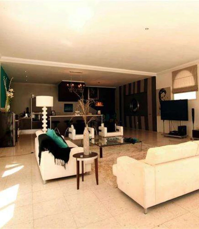 Standing out from most villas in the area, this property features four double bedrooms all on one level, all with light wooden floors and individual AC units and three of which having large patio doors leading out to spacious terraces. The master bedroom is over 55m2 with an en-suite bathroom and walk-in wardrobes and leads out onto the front terrace. Another bedroom suite has its own dressing room in between the ensuite shower room and bedroom, which in turn also leads onto the front terrace