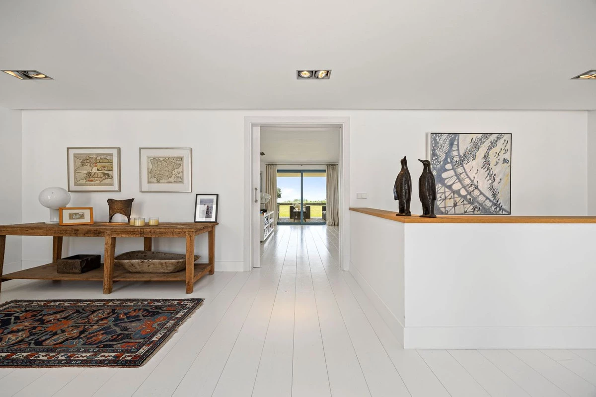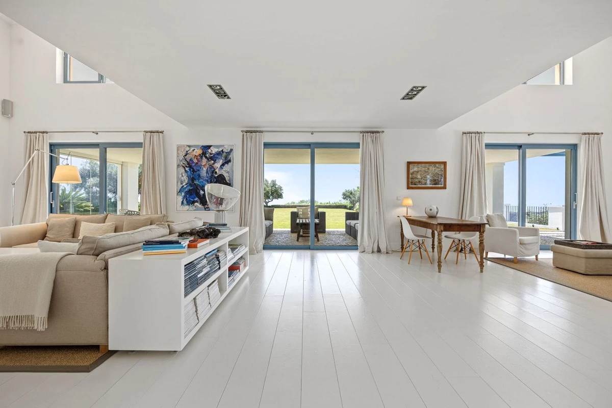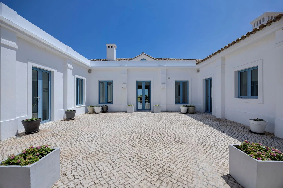 With nearly 700m2 of south-facing interior space, the home is thoughtfully designed for relaxed living and entertaining. Five en-suite bedrooms, expandable to six, are complemented by bright open-plan living areas, a home cinema, and a games room. Outdoor spaces feature a poolside bar, barbecue area, and expansive terraces for year-round enjoyment. The architecture reflects classic andalusian style, with a romantic central patio, whitewashed walls, blue shutters, and a layout that balances family comfort with refined hosting areas.
