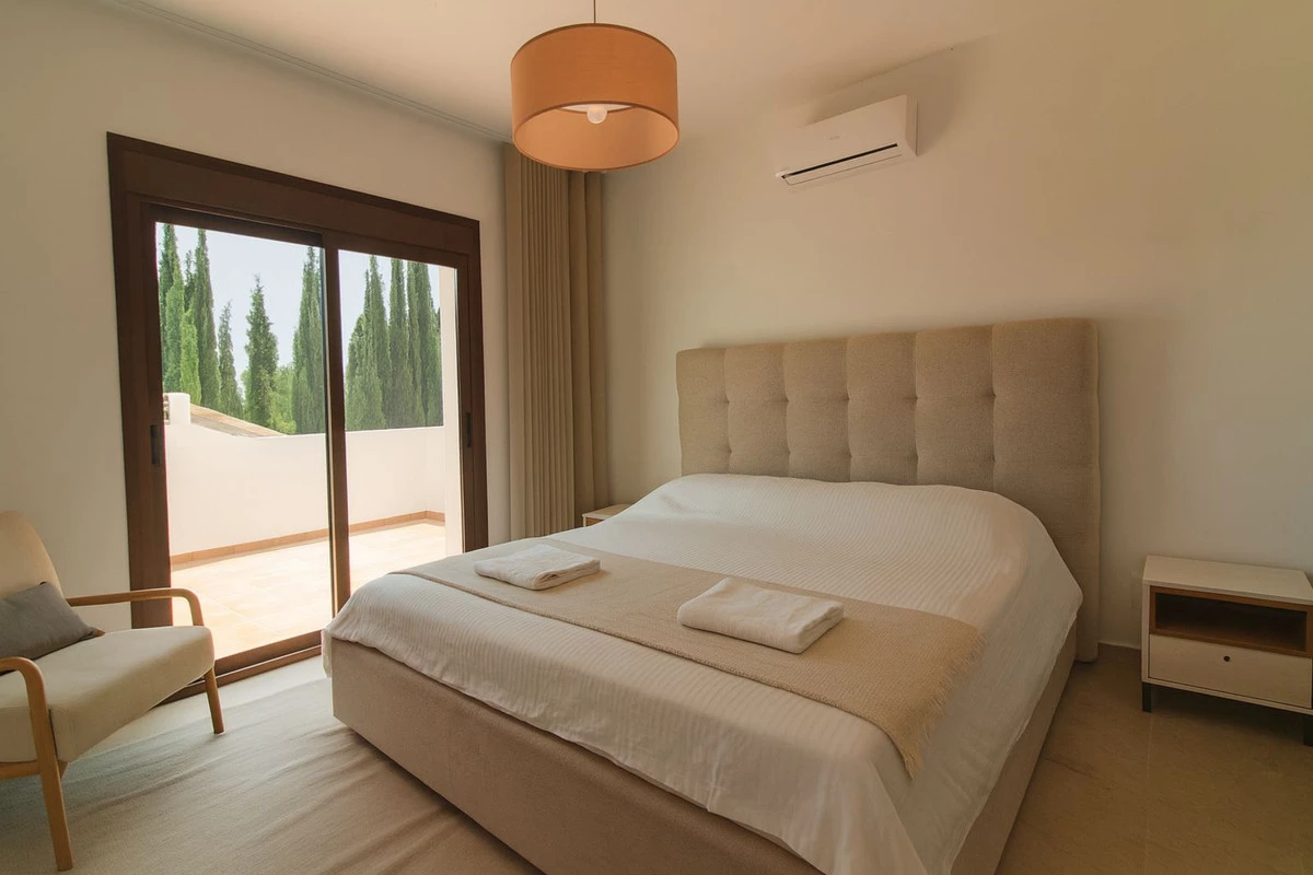 Upstairs, the entire upper floor is dedicated to the principal suite. This luxurious bedroom boasts an en-suite bathroom and direct access to a private terrace with serene views of the surrounding mountains—a perfect spot to relax and unwind.