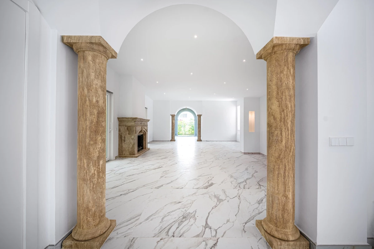 Step inside through a grand entrance with elegant pillars and marble floors that set the tone for this exceptional home. The open-plan living room features a grand fireplace, while the upper level enjoys natural light from a domed ceiling and large windows. The master suite includes a walk-in dressing room, a Juliet balcony overlooking the pool, and a sense of calm and privacy. The lower level adds flexibility with space for a gym, cinema, or guest suite—ideal for modern living.