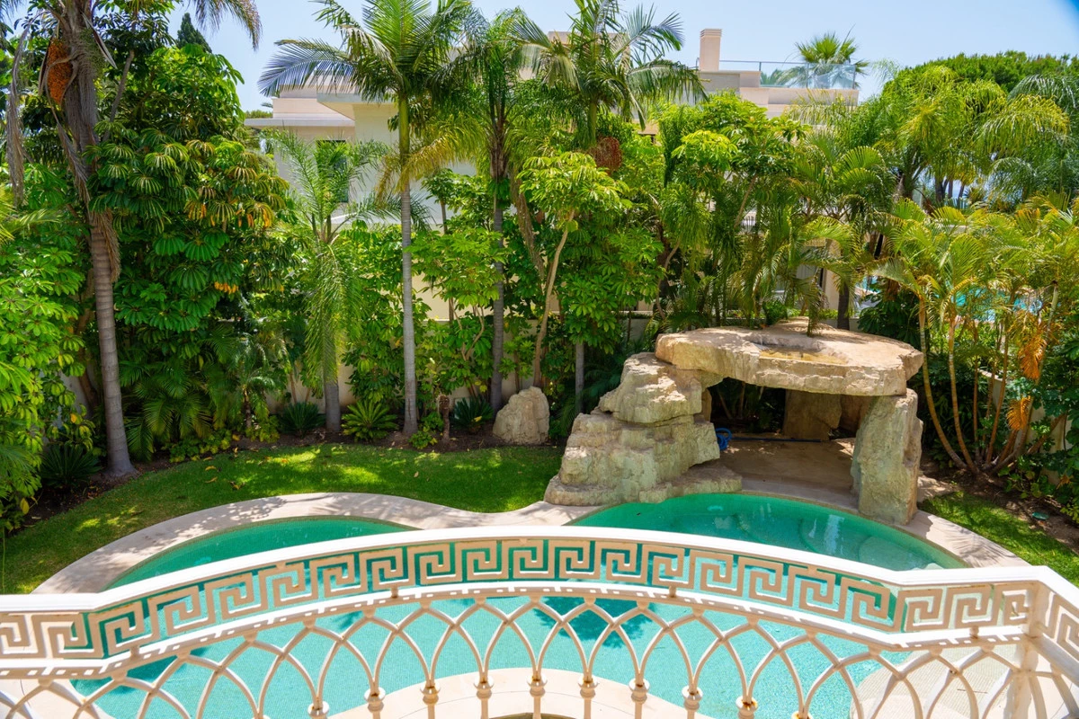 Outside, Villa Roma offers a private haven surrounded by tall palm trees. The pool, with its four waterfalls, creates a peaceful, spa-like atmosphere, while a stone terrace with a wood-burning barbecue makes entertaining easy. A fishlake beside the terrace adds to the villa’s charm and serenity. Every detail of Villa Roma has been designed with care, making it a rare opportunity to own a truly timeless property just moments from Marbella’s finest beaches.