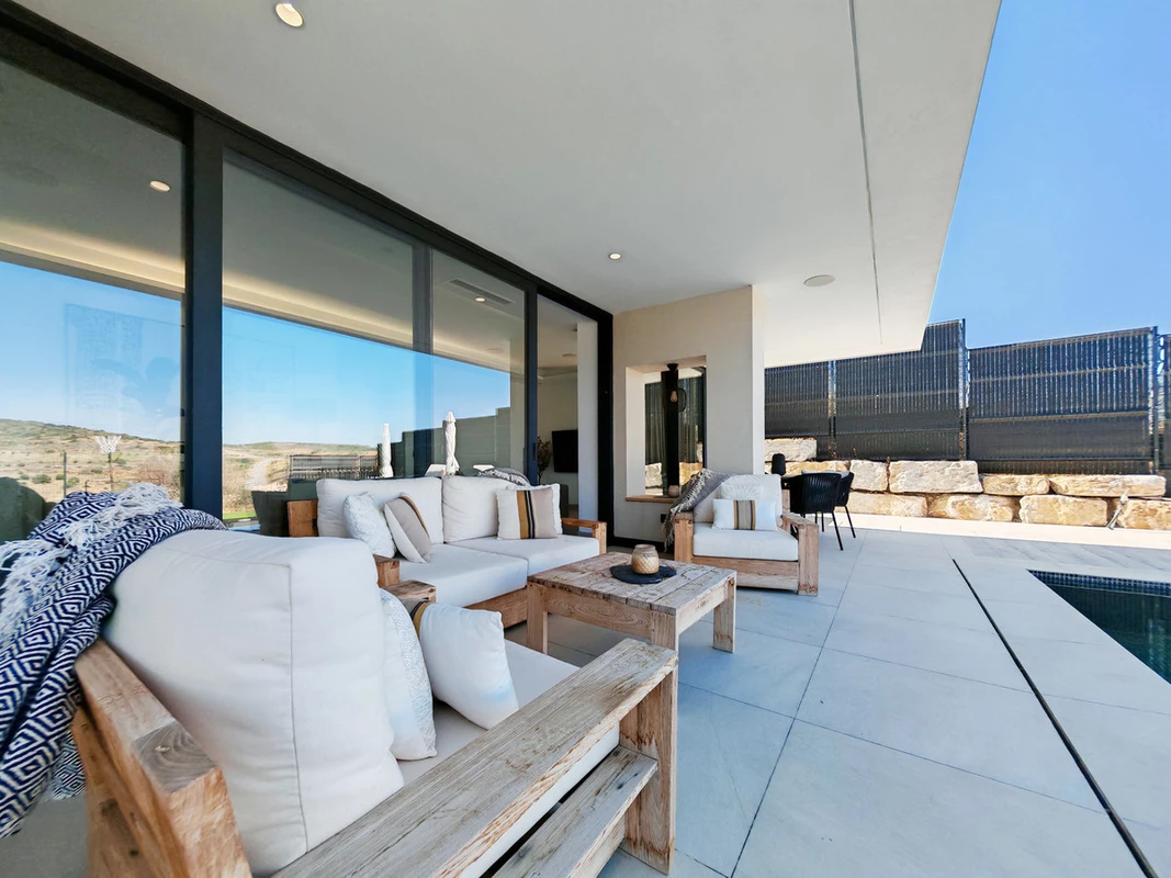 Villa for sale in , Estepona with 5 bedrooms, 3 bathrooms, 2 en suite bathrooms, 1 toilet and with orientation west, with private swimming pool, private garage (1 parking spaces) and private garden. Regarding property dimensions, it has 316 m² built and 495 m² plot. Has the following facilities amenities near, transport near, air conditioning, partly furnished, fully fitted kitchen, basement, guest room, brand new, dining room, security service 24h, guest toilet, private terrace, kitchen equipped, water tank, country view, mountain view, golf view, heated pool, automatic irrigation system, dolby stereo surround system, laundry room, internet – wi-fi, covered terrace, electric blinds, fitted wardrobes, pool view, panoramic view, underfloor heating (bathrooms), close to children playground, close to sea / beach, close to golf, uncovered terrace, glass doors, close to shops, close to town, close to port, close to schools and surveillance cameras.