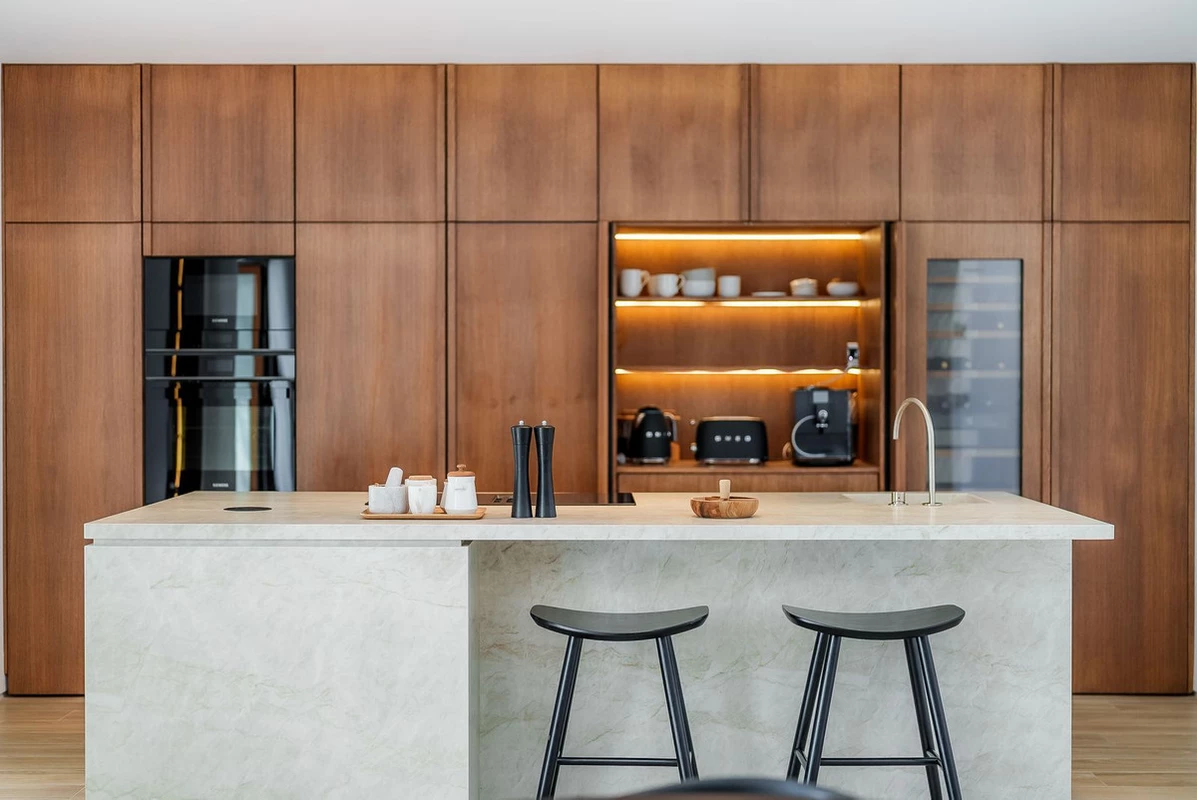 On the first floor you will find an open space living room together with custom made bespoke kitchen. Guest bedroom with the direct access to the garden and the terrace as well as guest bathroom. On the second floor there are 3 bedrooms and all with en suite bathrooms where master bedroom also has its own walk-in closet and private terrace overlooking the pool area. As an added value this apartment also has a laundry room that leads directly to the garage.