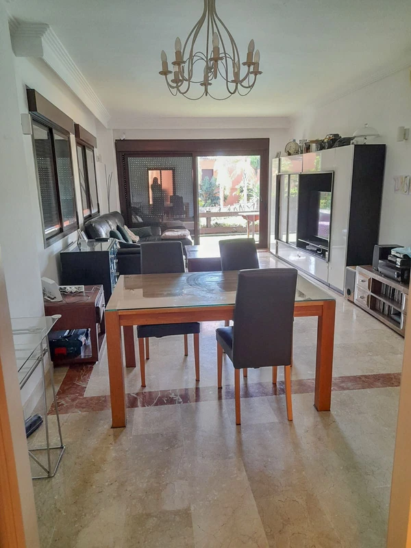 We present this spacious and very bright ground floor apartment. Upon entering, we find an entrance hall that leads to a separate kitchen with a laundry room and to a very open living-dining room thanks to a large window that connects to the generous terrace, with partial sea views, from which there is direct access to the communal pool. The living room also has two additional windows on the side, providing natural light throughout the day.