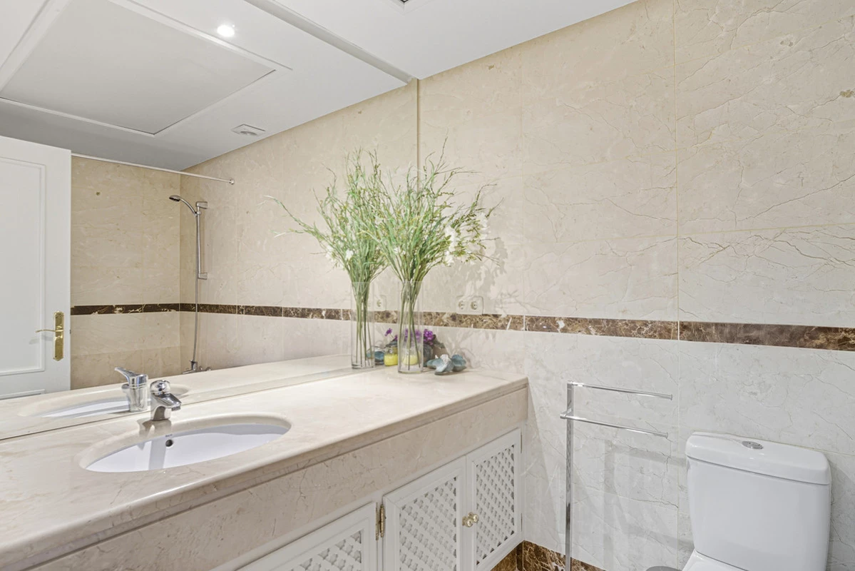 Elegant ground-floor apartment located in one of the most exclusive and peaceful developments in Nueva Andalucía. This carefully maintained property offers the perfect blend of comfort, privacy, and Mediterranean charm. It features two spacious bedrooms and two bathrooms, including a master bedroom with en-suite bathroom. Both bedrooms enjoy access to their own private terraces, providing plenty of natural light and added privacy. The independent kitchen is fully equipped and includes a convenient laundry area. The bright living-dining room opens onto a large private terrace with direct access to the communal pool, ideal for enjoying outdoor living all year round. Additional features include a private underground parking space and a storage room. Set within a gated community with 24-hour security, the complex is surrounded by lush tropical gardens, a lake, and a large swimming pool, offering a secure and peaceful environment. Ideally located just minutes from Puerto Banús, top golf courses, and all essential amenities, this property is an excellent choice as a permanent residence, holiday home, or investment opportunity.