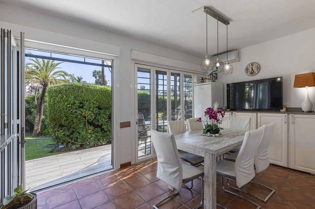 Finally, from your raised terrace you go down a few steps and walk straight into the community garden with palm trees and a swimming pool—a serene setting to read, play or work remotely in the open air. And, when you step outside the complex, the location is outstanding: a residential street in Nueva Andalucía, a short stroll from Puerto Banús and Centro Plaza, with amenities, restaurants and supermarkets just minutes away on foot; plus, by car you reach the Golf Valley (Aloha, Las Brisas, Los Naranjos), international schools and the A-7/AP-7 access in no time.