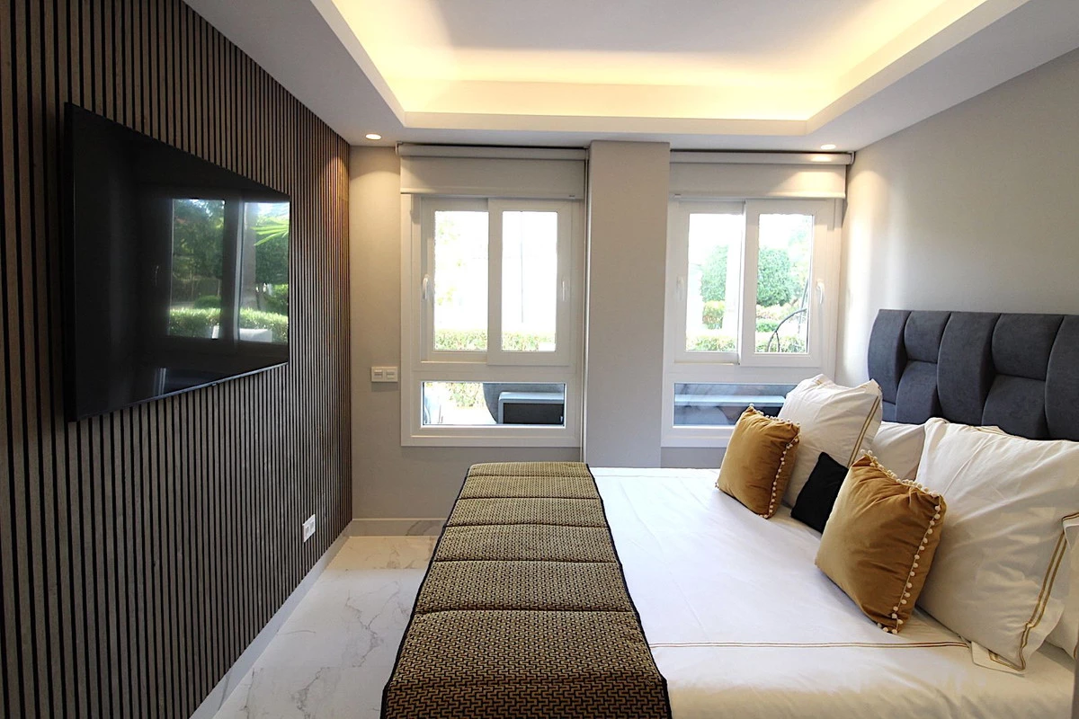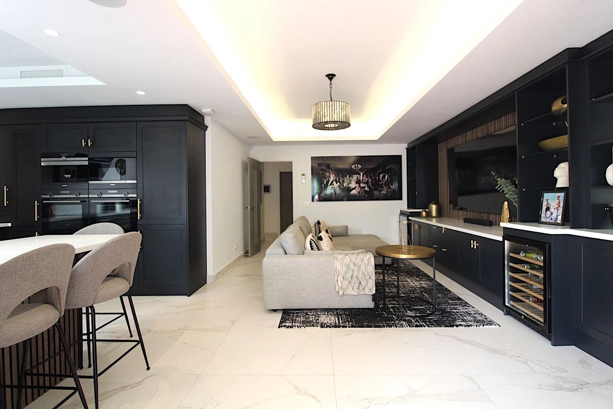 We are delighted to offer for sale this stunning newly listed corner garden apartment in the exclusive and first line development of Las Adelfas beachside in San Pedro de Alcantara. The property has been totally renovated to the highest level using only the finest materials and boast 4 bedrooms, 3 luxury bathrooms, spacious lounge dining area with state of the art open plan kitchen with breakfast bar, marble tiled flooring throughout, air conditioning hot and cold, new double glazed windows with electric security shutters, spacious terraces that surround the apartment with built in marble bar area including fridges and wine coolers for the ultimate entertaining. The terraces are very private with beautiful hedging and lead to the communal gardens and pool areas which are meticulously maintained for your relaxation and enjoyment. The development is gated with 24 hour security, first line to the wonderful beaches and mediterranean sea where you will find many top quality restaurants and bars to relax with family and friends. The apartment also enjoys a secure underground parking space with storage room and direct lift access to the property. If you are searching for the ultimate apartment in the best location then we can highly recommend viewing this amazing home as you will not be disappointed.