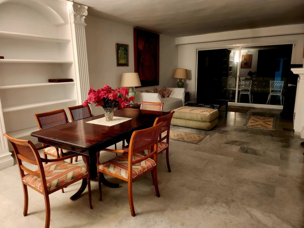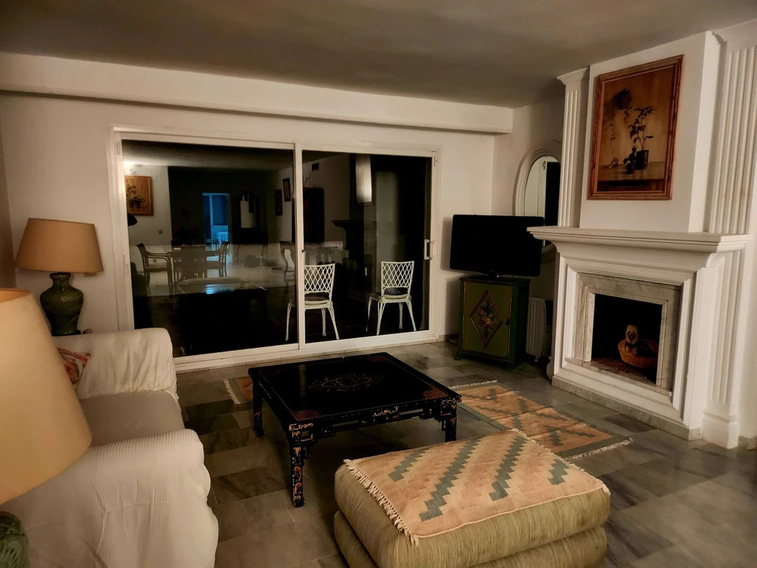 The apartment consists of 3 bedrooms, all with en-suite bathrooms (2 on the ground floor and one upstairs), two of which have access to a terrace, a large living-dining room with a fireplace and access to a terrace, a separate kitchen, and a guest bathroom.