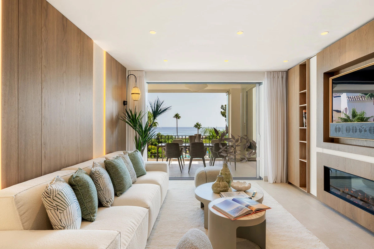 Bahía del Velerín 3.5 is a turnkey luxury apartment in a prime beachfront setting, refurbished to exceptional standards and ready for immediate occupation or rental. With 3 bedrooms, 2 bathrooms, 120 m² of elegant interior space and a 38 m² terrace overlooking lush gardens and the Mediterranean Sea, this home represents an outstanding opportunity.