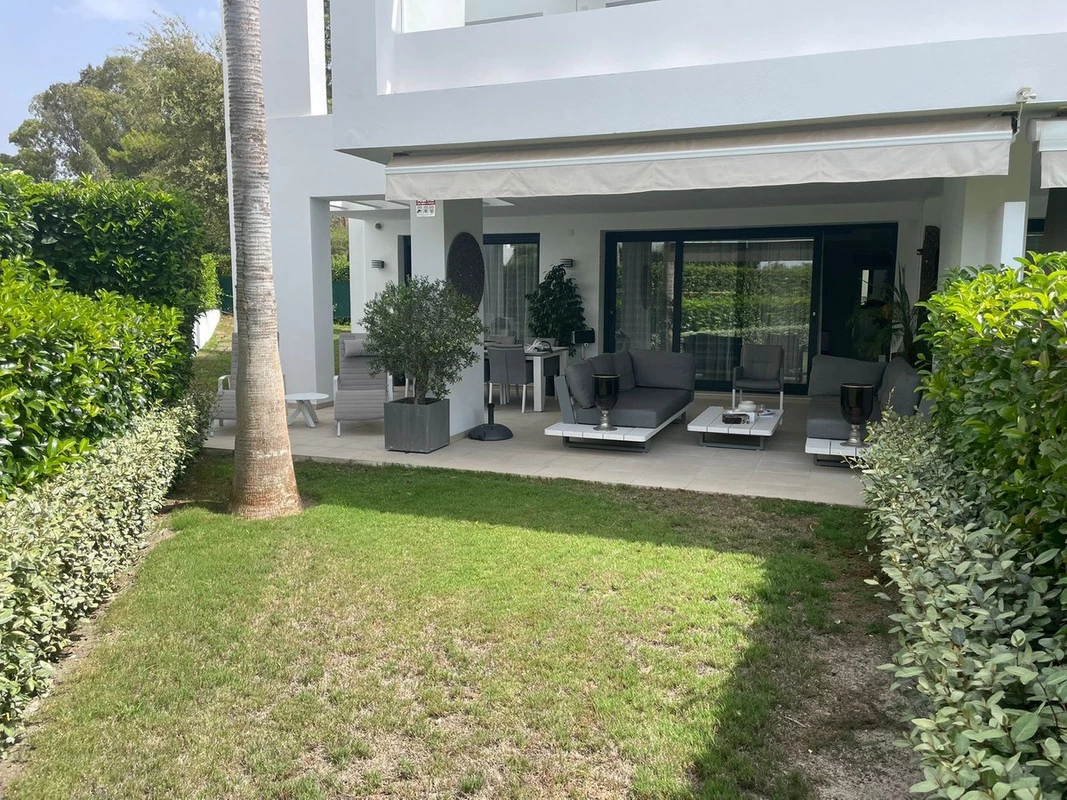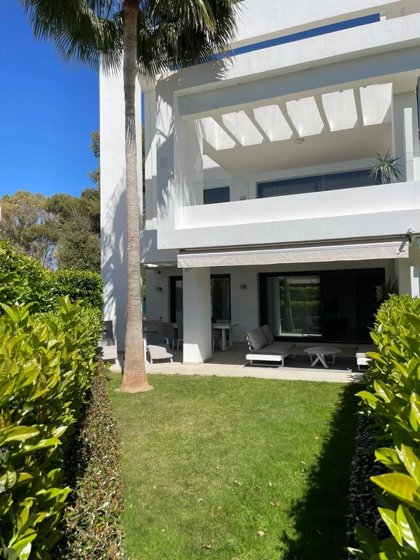 Corner ground-floor apartment with 2 bedrooms and 2 bathrooms (one en suite) featuring a spacious, sunny private garden of 122 m² in Las Terrazas de Atalaya.