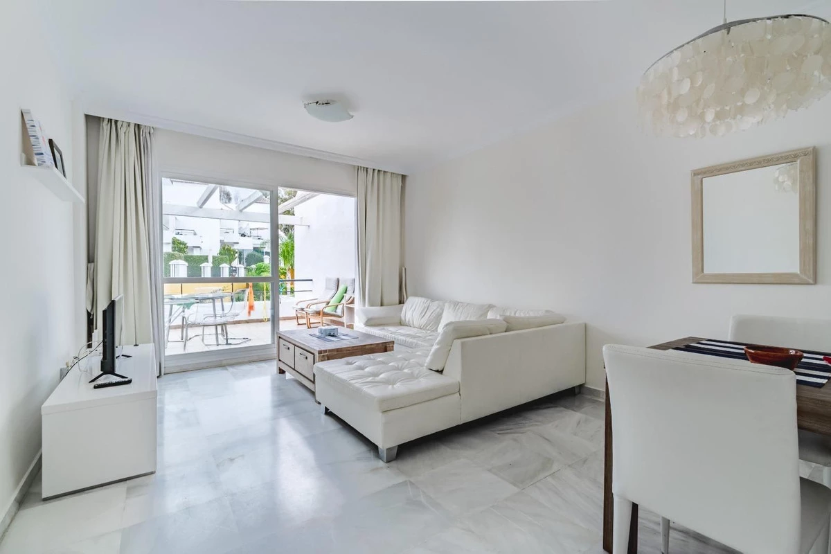Nestled in the heart of Marbella’s Golf Valley, this bright two-bedroom, two-bathroom apartment in 1st floor offers a peaceful and family-friendly lifestyle just minutes from Puerto Banús and Marbella town.Located in the sought-after gated community of Señorío de Gonzaga, with 24-hour security, beautifully maintained gardens and a communal swimming pool, the property combines comfort, light, and an unbeatable location.The spacious living–dining area opens onto a large terrace — perfect for enjoying Marbella’s year-round sunshine. The fully fitted and bright kitchen is conveniently connected to the main living space.Both bedrooms feature built-in wardrobes, and there are two bathrooms, one en suite. Three private terraces provide natural light and privacy throughout the day.Additional features include air conditioning, assigned private parking, and a bright orientation that enhances the sense of space and serenity.Set in a peaceful environment surrounded by renowned golf courses, and close to international schools, restaurants, shops and amenities, this property offers the perfect blend of lifestyle, security, and location in the Costa del Sol.AGB