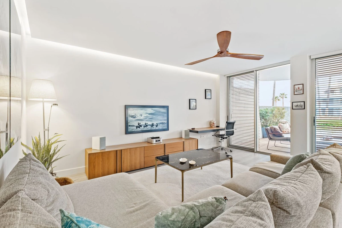 The home has a usable interior surface of 103.58 m², a main terrace of 35 m², and a private garden of 32.2 m². It includes two bedrooms and two bathrooms, one of them en-suite, as well as a 7 m² storage room and a private parking space. The property is equipped with aerothermal heating, underfloor heating, air conditioning, and domotic automated blinds, ensuring both comfort and modern convenience.
