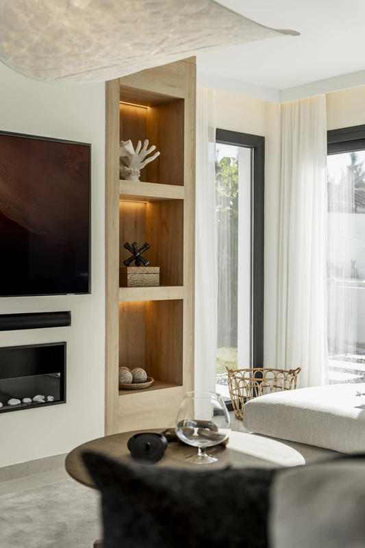 The main living spaces connect easily to the outdoor areas, allowing for a relaxed and open atmosphere. Large terraces offer plenty of room for outdoor dining, sunbathing, or simply enjoying the surroundings. The garden has been designed to be easy to maintain while still providing a pleasant setting around the house. An outdoor gym area adds a practical feature for anyone who values an active lifestyle without leaving home.