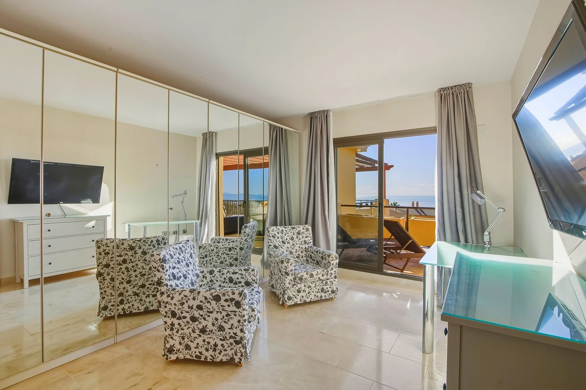 This exceptional 2-bedroom, 2-bathroom corner penthouse is located in the sought-after gated community of La Hacienda del Señorío de Cifuentes in Benahavís. Perfectly south-facing and elevated, it offers breathtaking panoramic views of the Mediterranean Sea, Gibraltar, the African coastline, and the surrounding mountains.