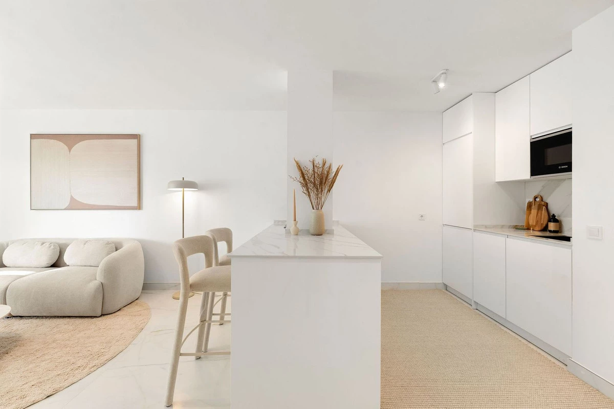 The apartment has been fully refurbished with a contemporary design, the interior features an open-plan layout that maximizes natural light and harmony. The bright living room flows into a sleek, fully equipped kitchen with integrated appliances and modern finishes. The spacious bedroom offers built-in wardrobes and a serene ambiance, while the elegant bathroom showcases high-quality fittings and a clean, modern style.