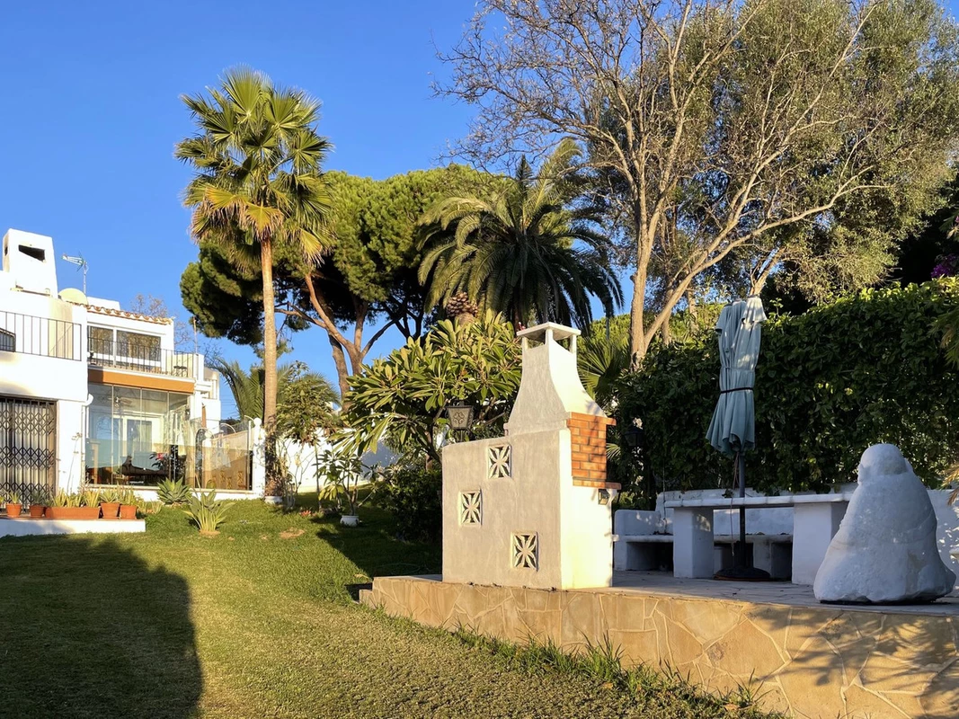 The property is arranged over two levels and welcomes you with a cozy front patio that immediately reveals the special character of the home. On the main floor there is a bright living room with fireplace, a separate kitchen, and a pleasant east-facing terrace that opens onto a beautiful private garden with a chill-out area and barbecue. From here, one can enjoy relaxing views of the Mediterranean Sea and, on clear days, the African coastline, creating an ideal space to unwind, socialize outdoors, and make the most of the Costa del Sol’s exceptional climate. The house is equipped with Somfy awnings, sliding Lumon glass curtains, hot and cold air conditioning, and solar panels, providing comfort and energy efficiency.