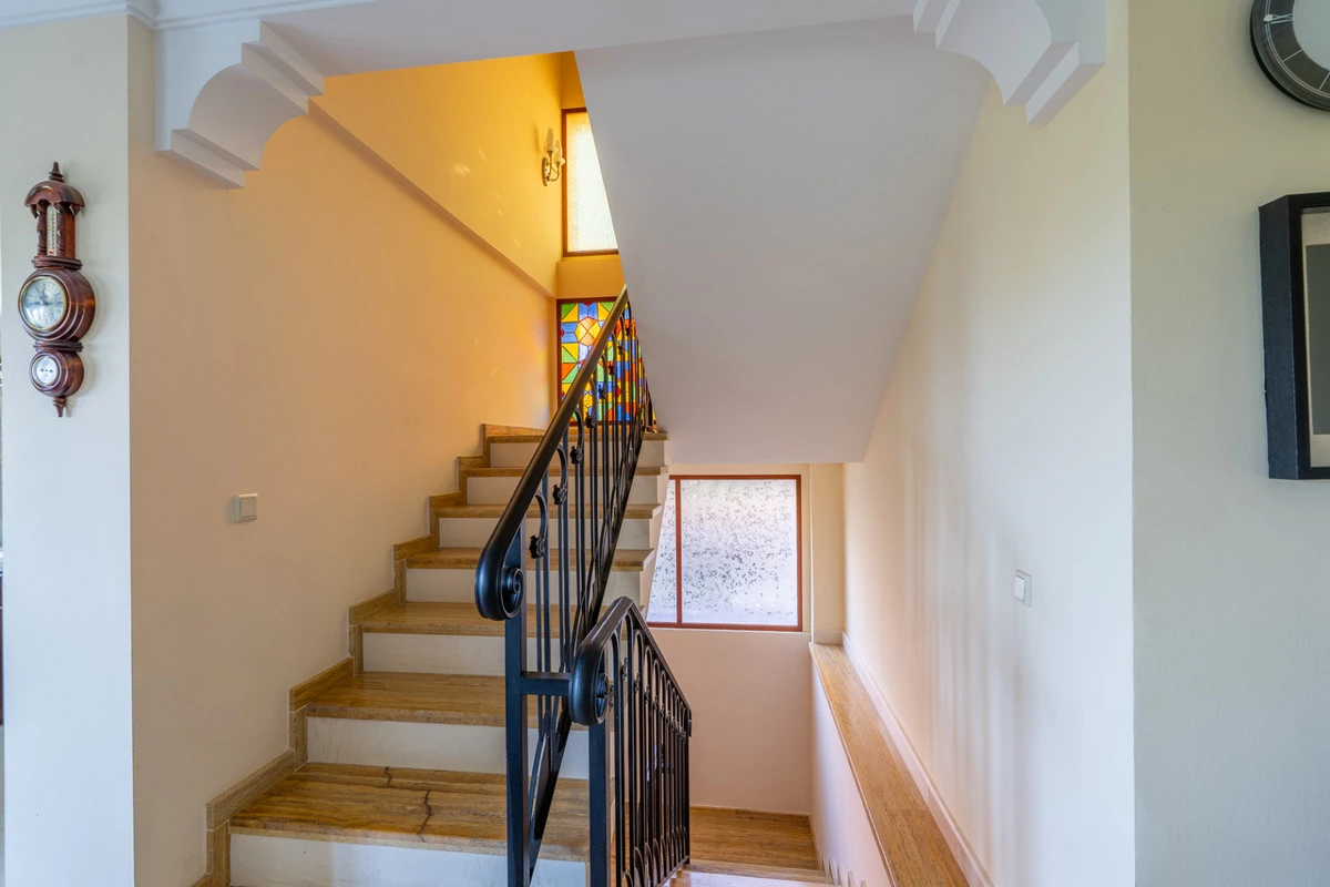 Built on a generous plot of over 1,300 m², the property boasts approximately 627 m² of constructed area across several levels. Its façade features timeless architectural details including columns, wrought iron balconies, and traditional tiled roofing. Inside, the villa comprises eight spacious bedrooms, nine full bathrooms, soaring ceilings, abundant natural light, and a layout that flows effortlessly into the outdoor spaces.