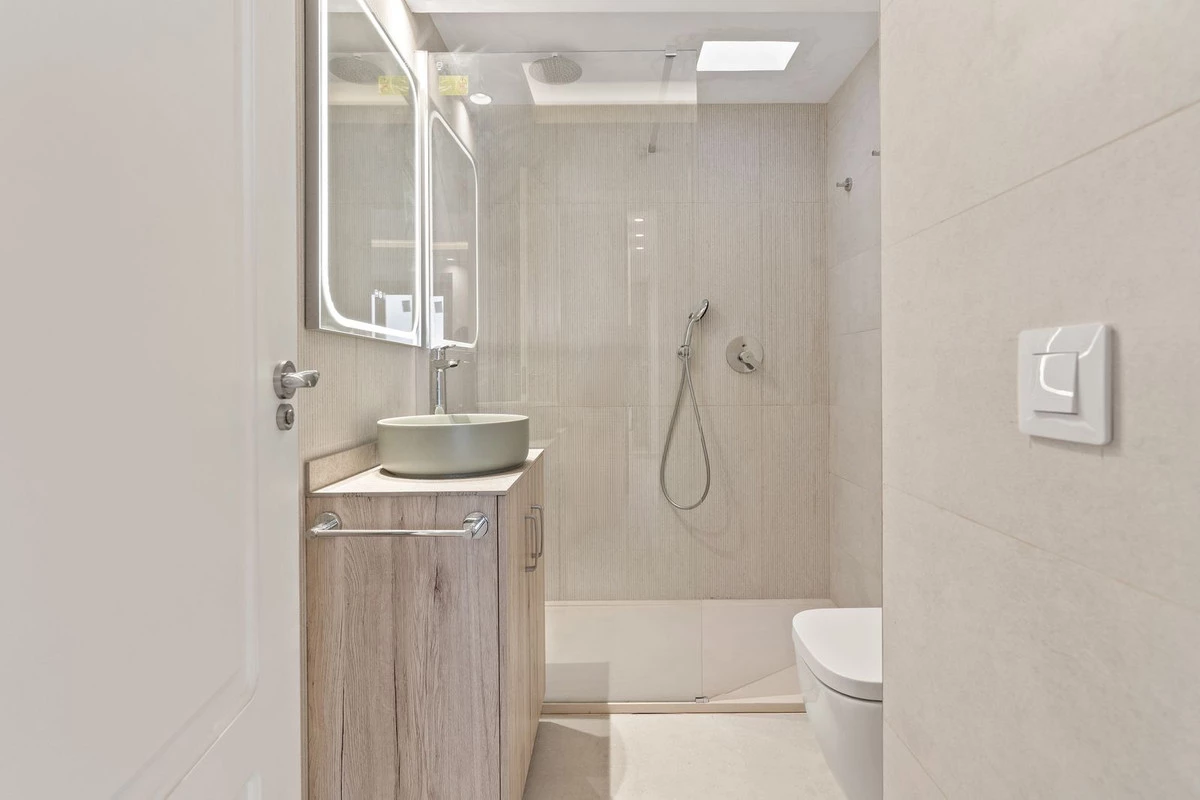 Bathrooms have been resolved with a contemporary and restrained approach, incorporating walk-in showers, refined fittings, and neutral textures. Storage solutions are integrated throughout the property, maintaining visual clarity while offering practical capacity.