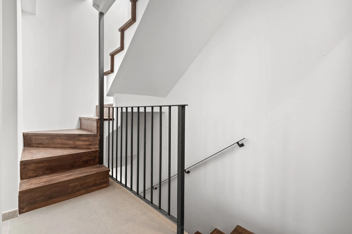 The entrance leads into a calm and well-defined interior where neutral tones and clean lines create a sense of continuity. Flooring, lighting, and carpentry have been carefully selected to enhance proportion and flow, resulting in spaces that feel both practical and understated. Natural wood details introduce warmth and contrast, reinforcing the connection between different levels of the home.